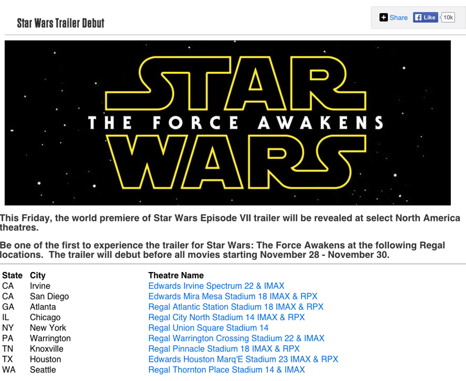 Good. Gooooood! Regal have revealed that you'll be able to see the hugely anticipated first trailer for Star Wars: The Force Awakens at 9 of their select locations this Friday. If you get yourself to any of the below theaters on November 28, 29, or 30 you will get to see the trailer before any movie screening on those days. We don't have any info on where and when it'll debut in the UK or any other regions (or online) yet, but we'll update ASAP.