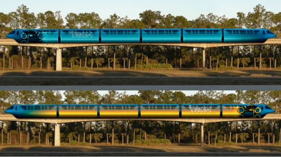 Disney Parks has revealed that the Monorail Trains are being skinned to advertise the new film. The art, as you can see in the above concept images, makes the mororail trains appear to be a lightcycle from the world of tron, complete with a trail of colored light. According to the report, the transformed trains will be visible on the Epcot monorail line as early as this month.