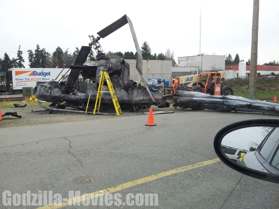 Godzilla-Movies and YVRShoots have posted the following set photos (which will likely be the first of many) from the set of Legendary Pictures' Godzilla 3D reboot, which began production in British Columbia yesterday. As you can see, the first image features a military helicopter which has clearly seen better days after an encounter with the iconic monster. The others show what look to be an airport terminal in Japan. Additionally, Legendary posted the following video on their Facebook page with a greeting from director Gareth Edwards. Stay tuned to CBM for more news as we have it.