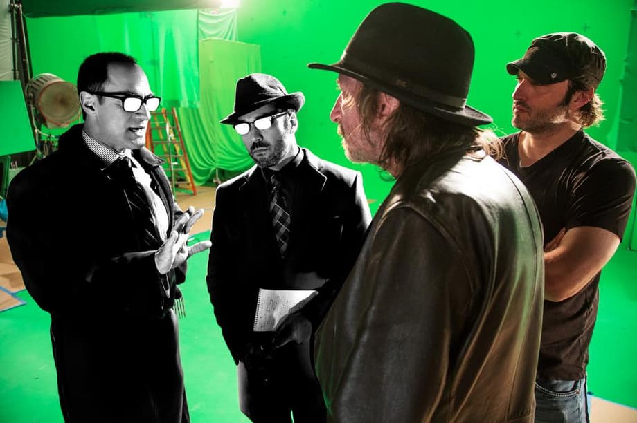 Director Robert Rodriguez has just posted a new behind-the-scenes snap from Sin City: A Dame To Kill For, giving us our first look at the characters played by Jeremy Piven (Entourage) and Christopher Meloni (Man Of Steel).