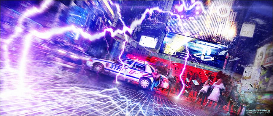 Conceptual illustrator Scott Lukowski ("Watchmen"), has updated his website with concept art for Marc Webb's The Amazing Spider-Man 2. These two images depict Spider-Man (Andrew Garfield) battling Electro (Jamie Foxx) in Times Square.