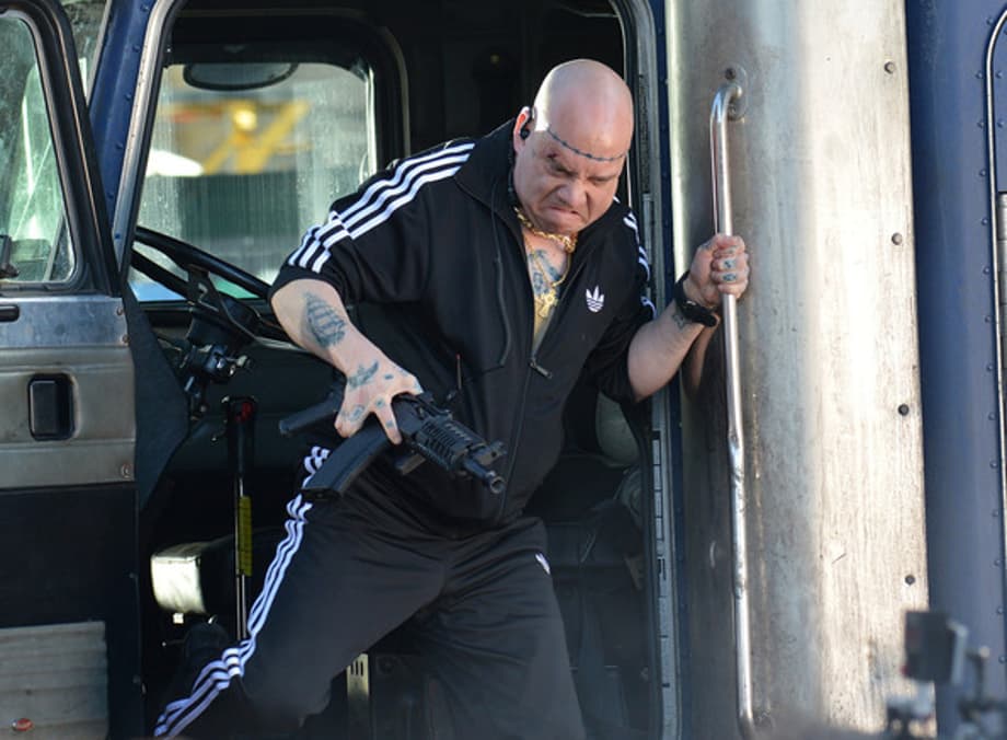 AMAZING SPIDER-MAN 2 Set: Paul Giamatti Toting A Gun & Spidey Protecting Bus Passengers