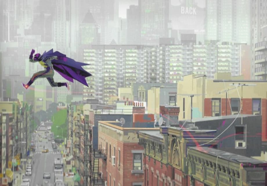 This gorgeous piece of concept art shows the inexperienced Miles Morales swinging through New York City with Peter B. Parker in tow for one of the funniest scenes in the entire adventure.
