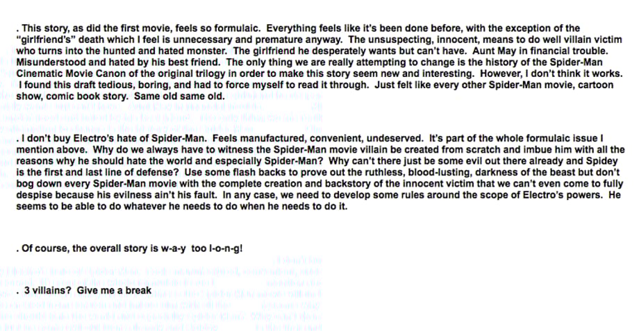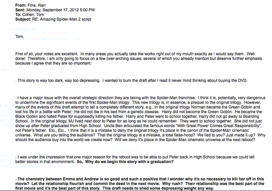 In an email from 2012, Marvel President Alan Fine explains to Tom Cohen (Marvel's VP of Production who acts as an intermediary between them and Sony) all of the problems with The Amazing Spider-Man 2. "I wanted to burn the draft after I read it, never mind thinking about buying the DVD."