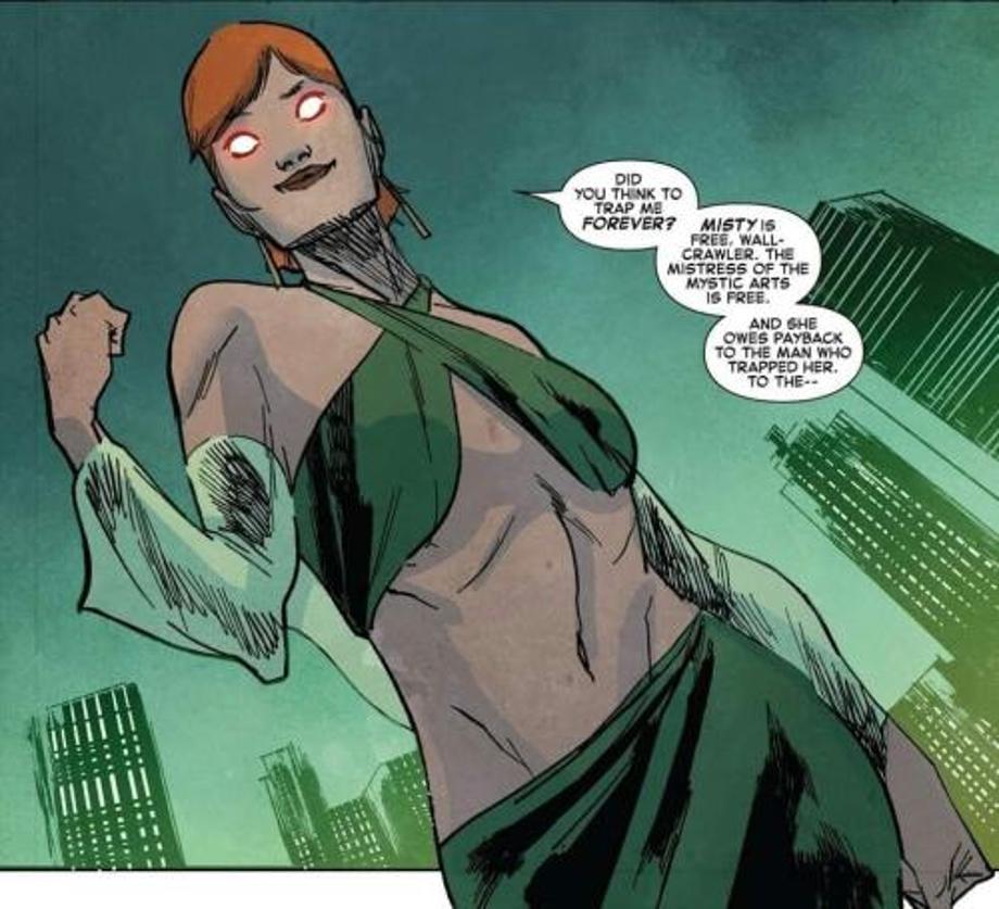 Kristy leaps into the basement! Elyse rushes towards the young hero, knife in hand, yelling at Kristy for mutilating her! Kristy’s skin turns metal and the knife shatters against it! Throughout all this, MJ has been slowly trying to untie the ropes around her. Mysteria summons green fog and Kristy develops X-Ray vision. But, with her X-Ray vision comes her losing the metal skin because she can only have one power at a time. Elyse punches Kristy to the ground as the portal expands and Dormammu’s Mindless Ones begin to crawl out into the basement!