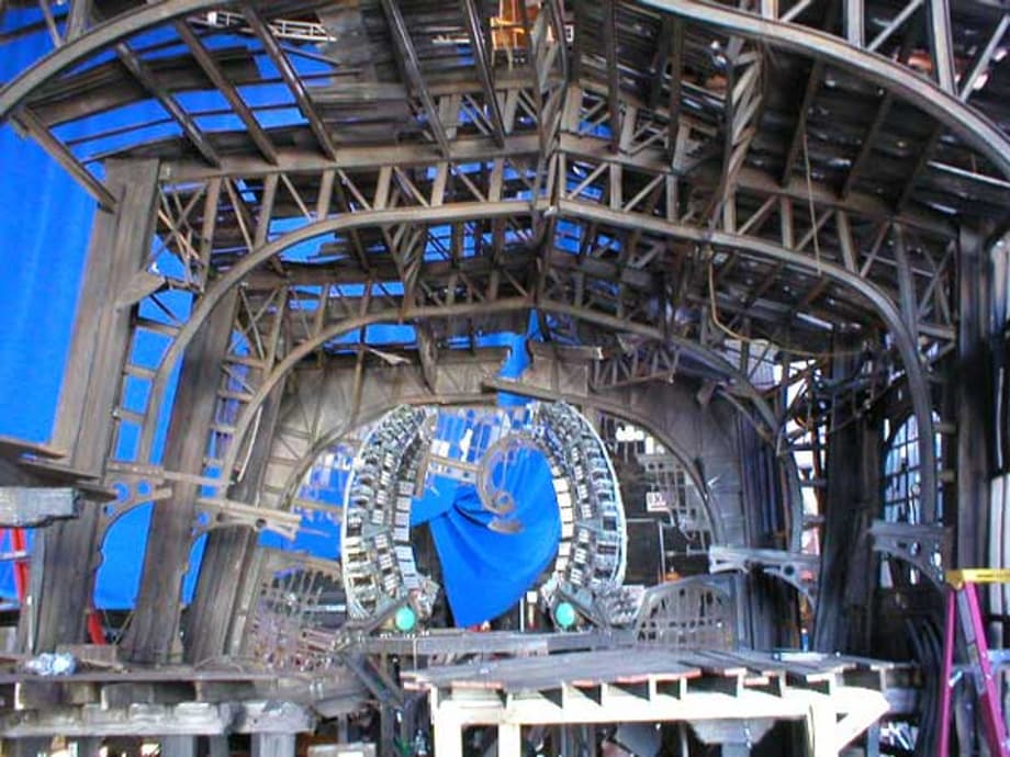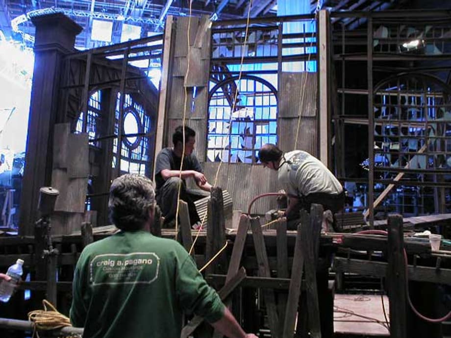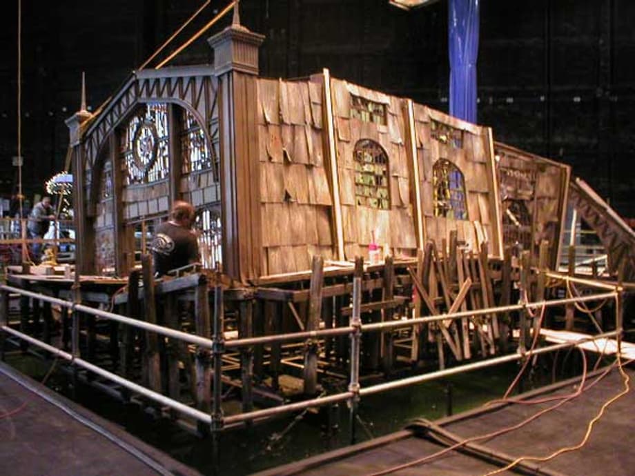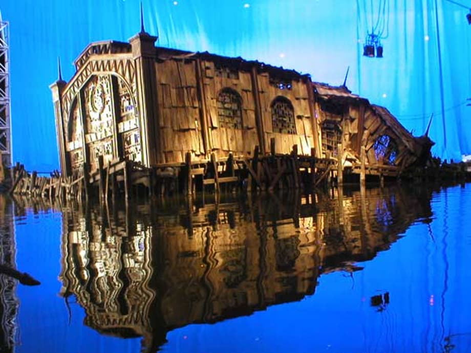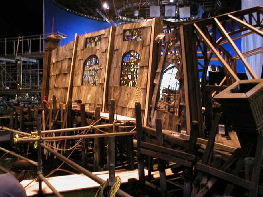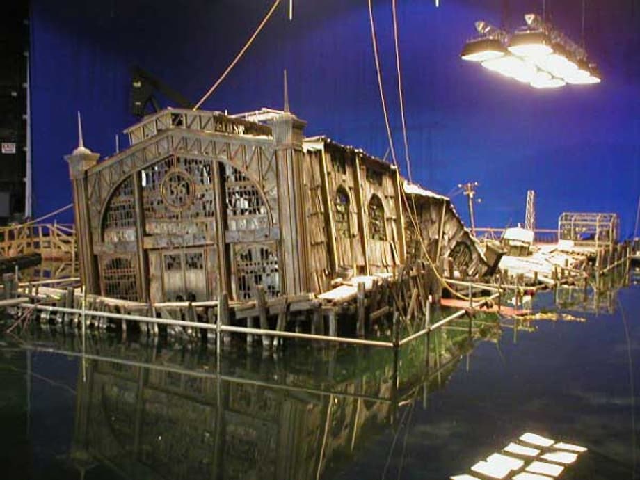 McCune Design built a 60' long 1/4 scale wharf and warehouse in the tank at Sony’s stage 30. The miniature was destroyed and submerged over a three-day period according to the storyline. An interior complete with “Doc. Oc’s” Fusion Machine, and a copper-sheeted lifeboat were created for interior destruction shots. A miniature electrical-generating platform was pulled with a high-speed winch as it careened down the wharf into the warehouse impacting and destroying the side of the structure.