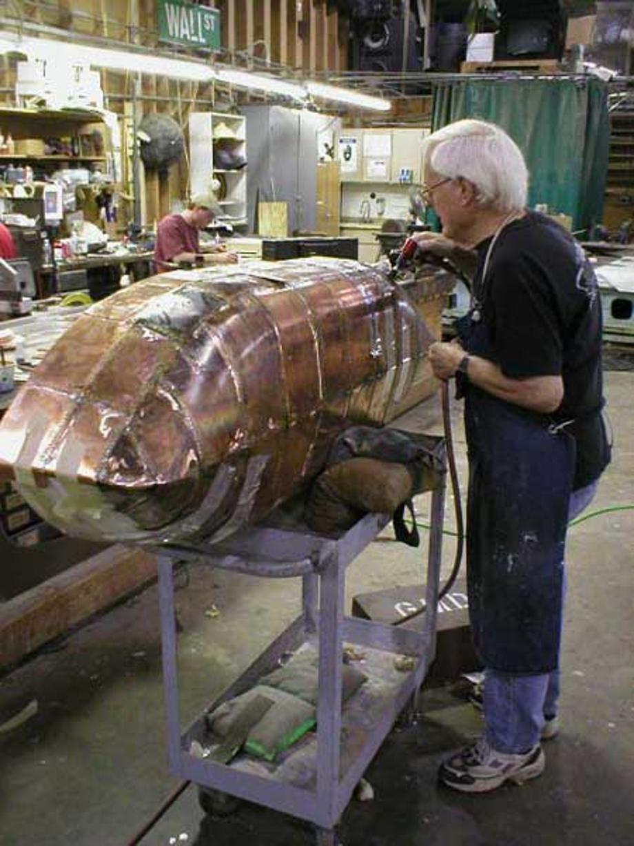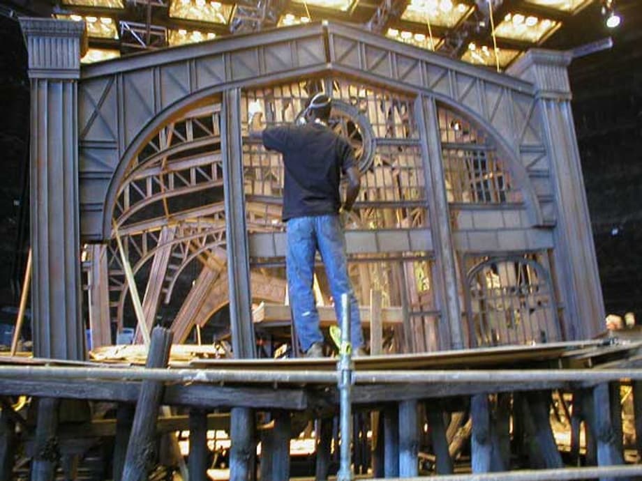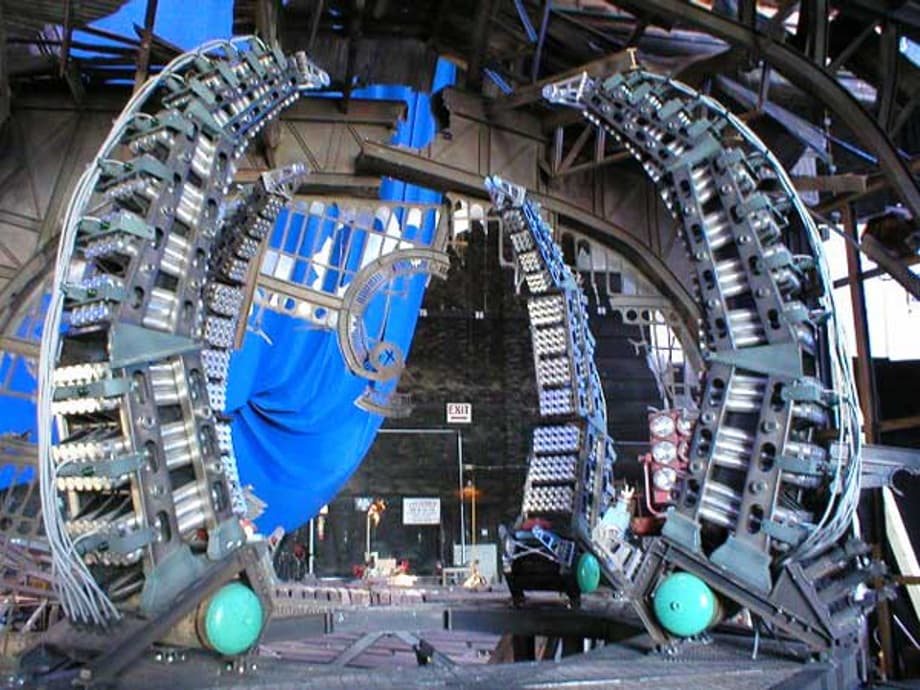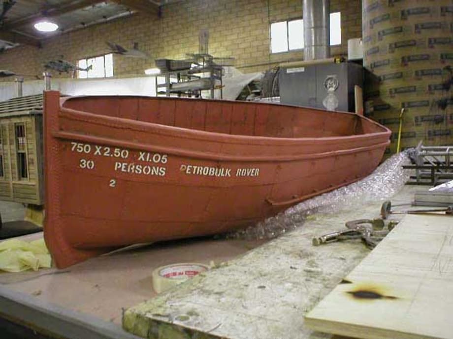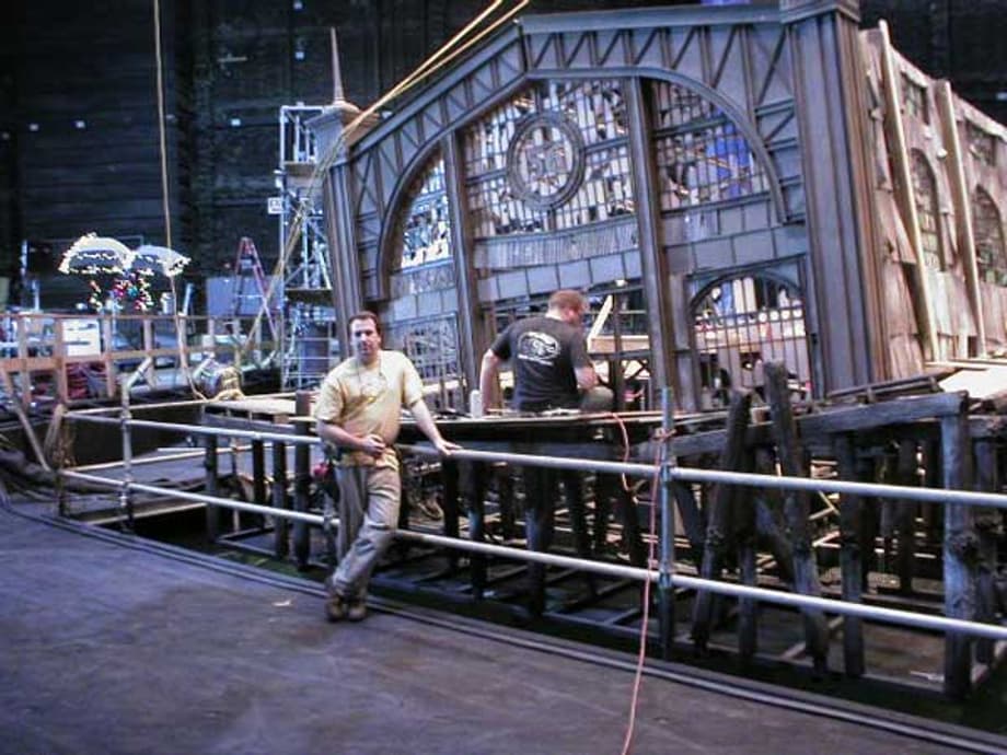 McCune Design built a 60' long 1/4 scale wharf and warehouse in the tank at Sony’s stage 30. The miniature was destroyed and submerged over a three-day period according to the storyline. An interior complete with “Doc. Oc’s” Fusion Machine, and a copper-sheeted lifeboat were created for interior destruction shots. A miniature electrical-generating platform was pulled with a high-speed winch as it careened down the wharf into the warehouse impacting and destroying the side of the structure.