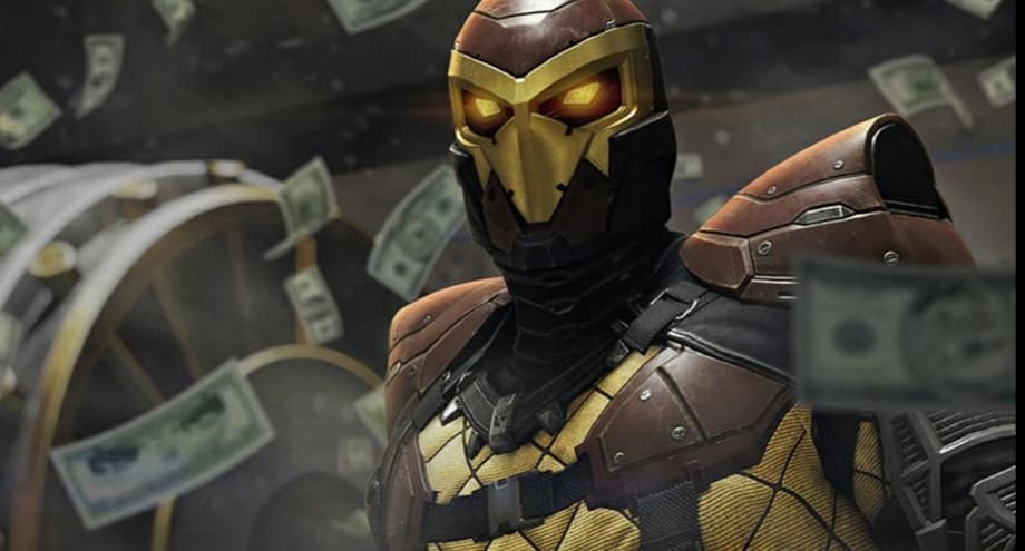 This is definitely The Shocker but it appears as if the classic comic book villain has undergone quite a few changes here as he robs a bank (likely moments before being foiled by a certain superhero).