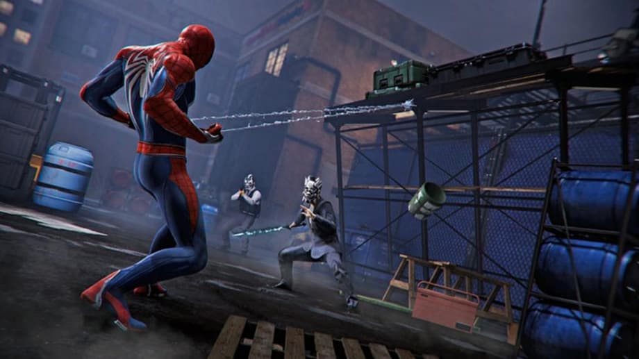Mr. Negative (one of Spider-Man's lamest villains if we're being honest) is going to play a key role in the game and here we see Spidey using some webbing to pull down scaffolding on his goons.
