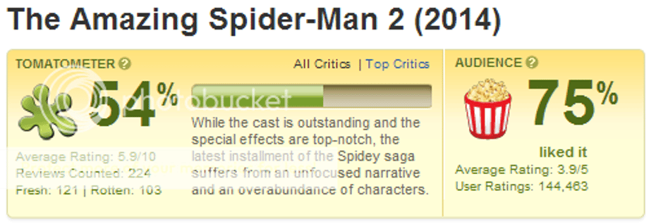 I thoroughly enjoyed the film and it reminds me of the first time you go on a rollercoaster and your family is trying to scare you before going on. You are timid in line and then full blown terrified and close to tears on the ride but as it goes on, your fears slowly fade and it turns out it wasn't as bad as your family made it out to be and instead, it was alot of fun and probably some of the most fun you've had in a while. This movie boasts some of the best Spidey scenes of all time and the ending is probably one of the most saddest due to the strong preformances in the movie. This isn't like Green Lantern or Batman & Robin it's a film that does more right than wrong. So all in all, be your own person and don't follow review sites. "WELL WHAT IF THEY SHARE THE SAME VIEWS AS ME?" Well that's fine and dandy but every single movie? Seriously? There's a reason why no two people are exactly the same.