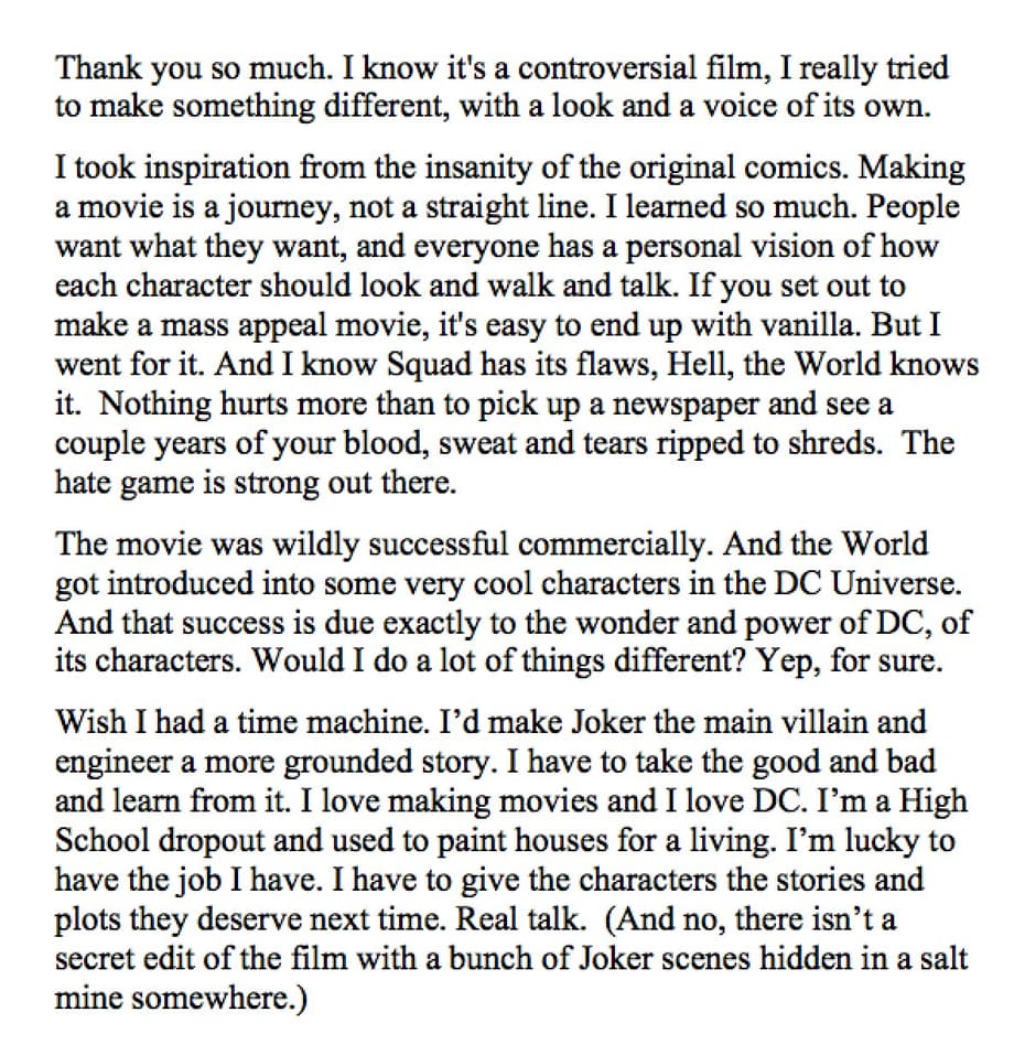 Late yesterday, Ayer decided to tackle his criticisms head-on when he penned a heartfelt letter to a fan where he reflected on his journey to make Suicide Squad and where he also goes on to thank fans for their support, acknowledge his shortcomings, and makes a promise to be better in the future. The biggest takeaway from the note comes at the top of the final paragraph where he expresses his regret at not making the Joker his film's main villain as that would've allowed him to tell a much more grounded and coherent story.