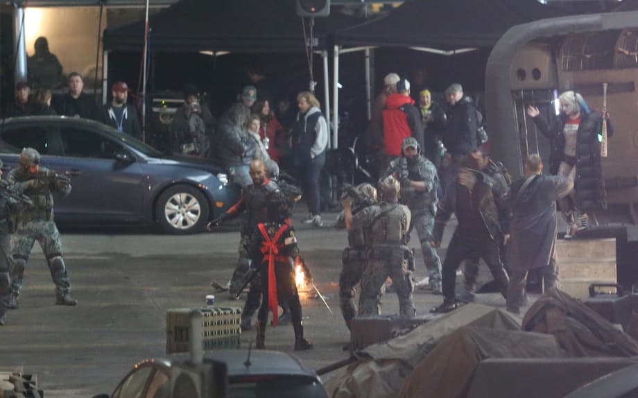 Late last night, the ensemble cast and crew of Suicide Squad once again took over the streets of Toronto, Canada, which is doubling for Midway City in the DC Comics adaptation. And now the latest photos and videos from the shoot feature the Task Force X making a big entrance before taking down an unknown target while surrounded by the army. Offering a new look at Will Smith (Deadshot), Margot Robbie (Harley Quinn), Scott Eastwood, Jai Courtney (Captain Boomerang), Adewale Akinnuoye-Agbaje (Killer Croc), Joel Kinnaman (Rick Flag), with Adam Beach (Slipknot), Karen Fukuhara (Katana), and Jay Hernandez (El Diablo), all the goods can be observed below.