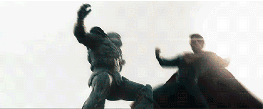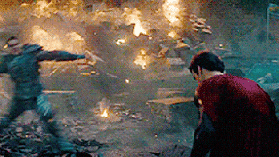 abs Ma Kent by the neck as they interrogate her. Faora looks for the Kodex once Ma Kent eyes at the barn. It's not there. "WHERE IS THE KODEX!?", screams Zod, standing menacingly over Ma Kent. Just before SUPERMAN flies in, super-tackles Zod through 2 silos, then across the cornfields, and continues to punch him repeatedly in the face whilst saying "You think *punch* you can threaten *punch* my mother?! *punch*" until finally continuing to super-tackle him through a 7-Eleven convenience store (which no doubt people are inside of) and then subsequentially going through the building, crashing into and blowing up the gas pumps in front, where civilians can be seen standing near. Zod scrambles, just having the shit punched out of him (and being weakened by the rush of super-powers from Earth's atmosphere (being weakened by getting super-powers, lol)), and retreats to his ship. Then, behind Superman, comes walking up the street (like a boss) Faora and Blaster from