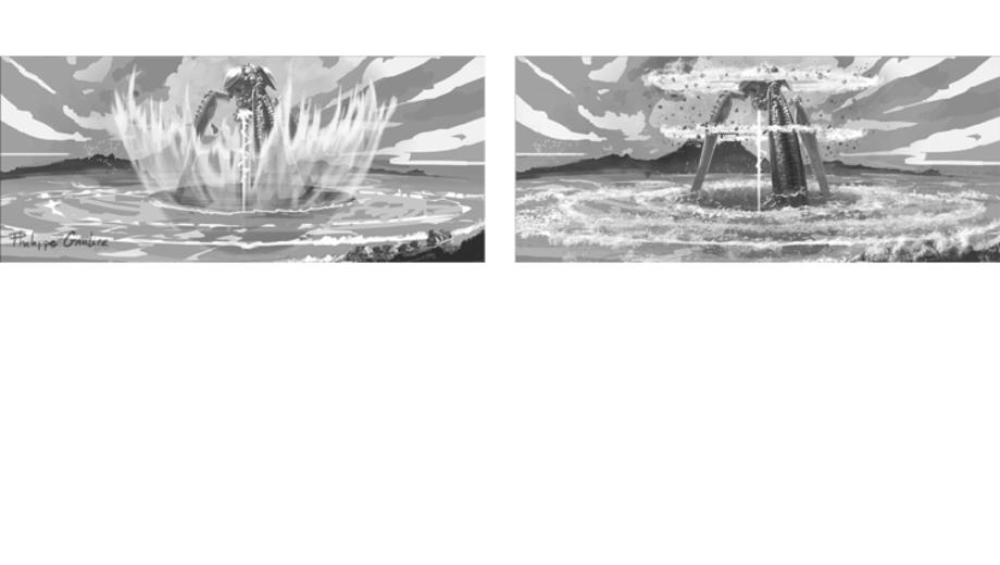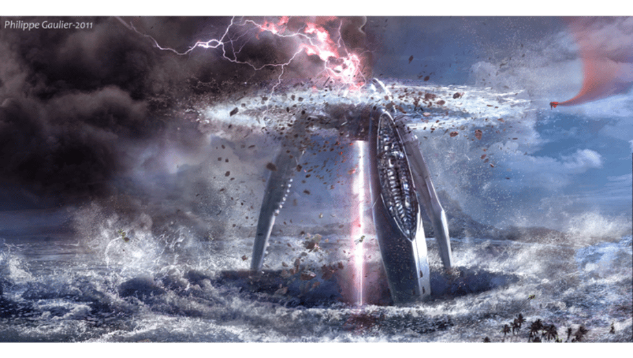 In Zack Snyder's 2013 superhero film Man of Steel, wants to terraform Earth so that its mass and atmosphere is more Kryptonian friendly. To do this, General Zod deploys the World Engines to Metropolis and the southern Indian Ocean. It is up to Superman (Henry Cavill) to destroy the World Engine in the Indian Ocean, which he does by penetrating its hull in a burst of anger. Conceptual artist Philippe Gaulier helped design that exciting sequence and now you can check out his concept art below.