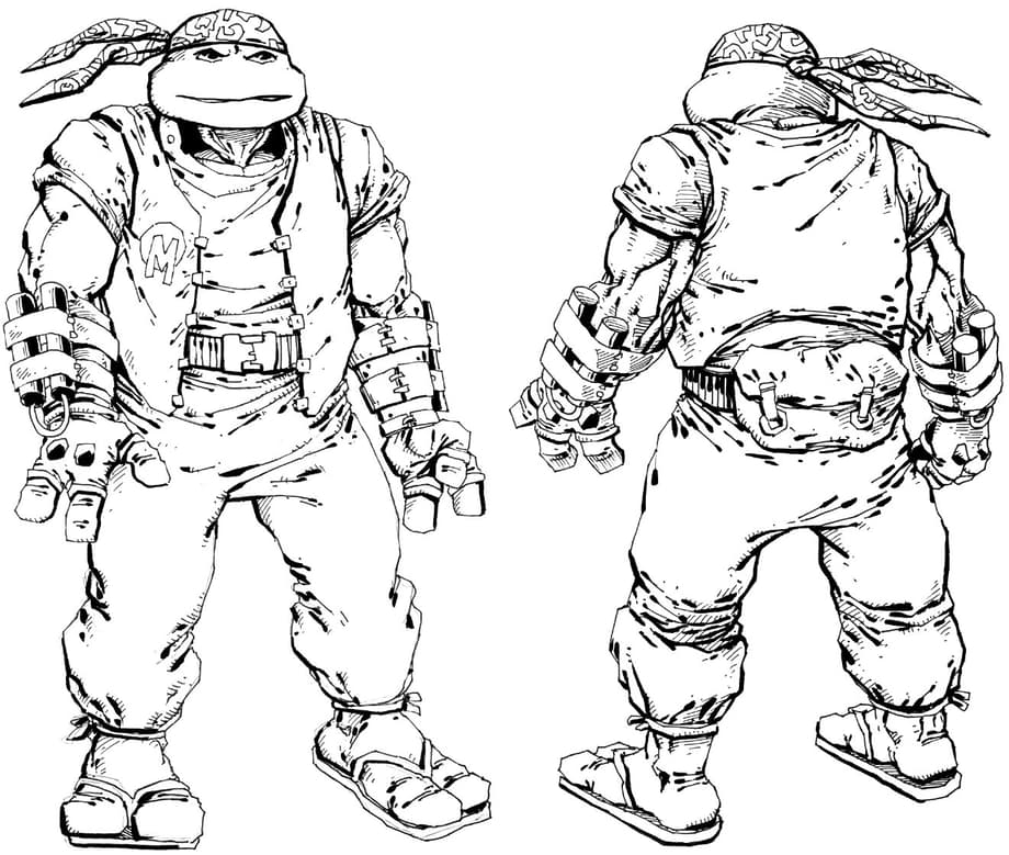 "Here we gave Mike a more “street” look because his new mutation gave him the ability to project a human appearance onto his turtle features, allowing him to interact freely with humans." - PL