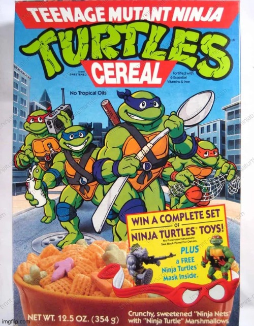 A cereal box and several t-shirts spotlight Leonardo, Donatello, Raphael and Michaelangelo, who will be depicted as younger teens for the first time on the big screen (they're usually supposed to be around 16 or 17).