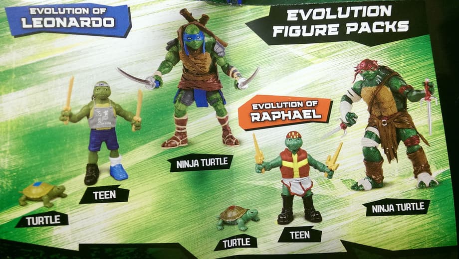 Hard to believe, but it was all the way back in March of 2012 when we all learned that the working title of the Michael Bay-produced film was Ninja Turtles. Some people were instantly turned off by the implications that the Turtles would not be mutants nor would they be teenagers. Bay even referred to them as "aliens" and that got people quite angry, as you well know. Many months later, Paramount alleviated concerns by putting "Teenage" and "Mutant" back into the title. Clearly, it was a last minute decision as early looks at toy packaging used "Ninja Turtles" as the title. Seems like "Ninja Turtles" will be a more accurate title for the flick as a new image of the "Evolution Figure Packs" feature teenage versions of the Turtles that look dramatically different from the finished versions. The good news? There are baby turtles, so we at least know they aren't aliens.