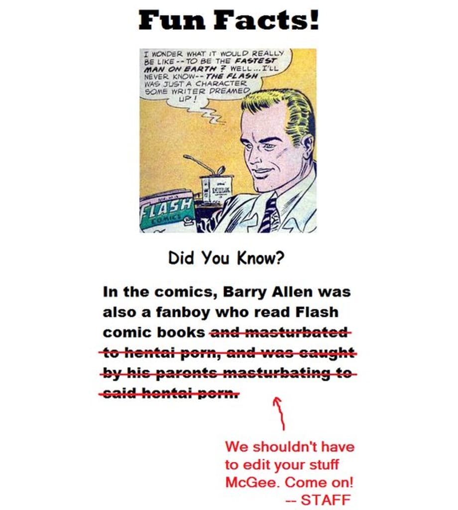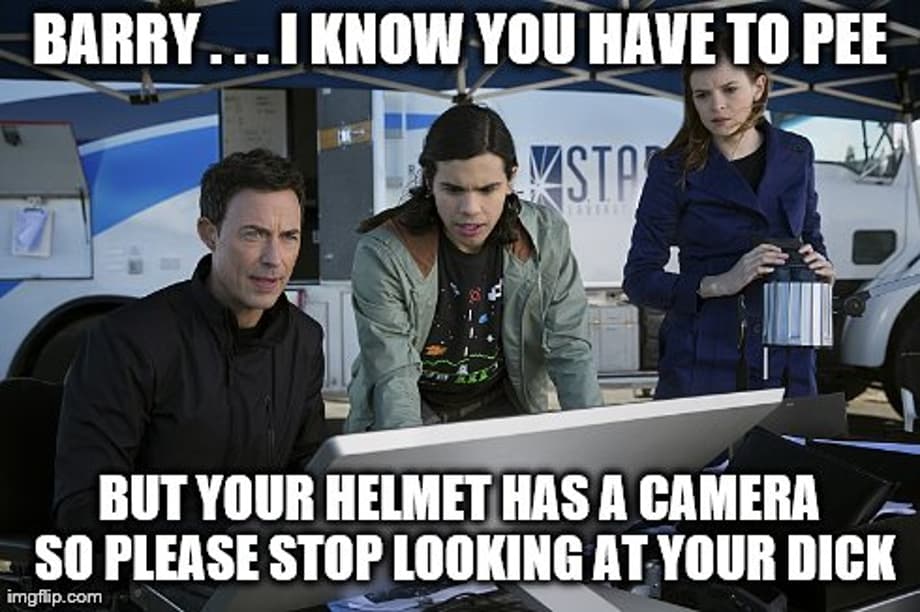 We cut to present day Central City. We see Grant Gustin's goofy ass Barry Allen running into people, on purpose, just so he can cop a feel. Pervert. I tried something very similar years ago when I pretended to be blind at a shopping mall. I won't lie, I got quite a few good gropes in before coming across a tank top wearing US Marine with a lascivious tattoo of Catwoman on his upper pectoral that was seriously begging to be Bill Finger'd by me! The Marine pulled yours truly up by the collar of my shirt and curtly inquired as to what my major malfunction was. Now, I should mention that my dad was also a Marine. As a kid, I was a military brat. Having grown up around military folk, I knew weakness was something I dare not show. So I said the first thing that popped into my fear stricken brain. I looked this man dead in his eyes and told him to take his five dollar ass back to Iraqistan before I made change for a buck fifty.