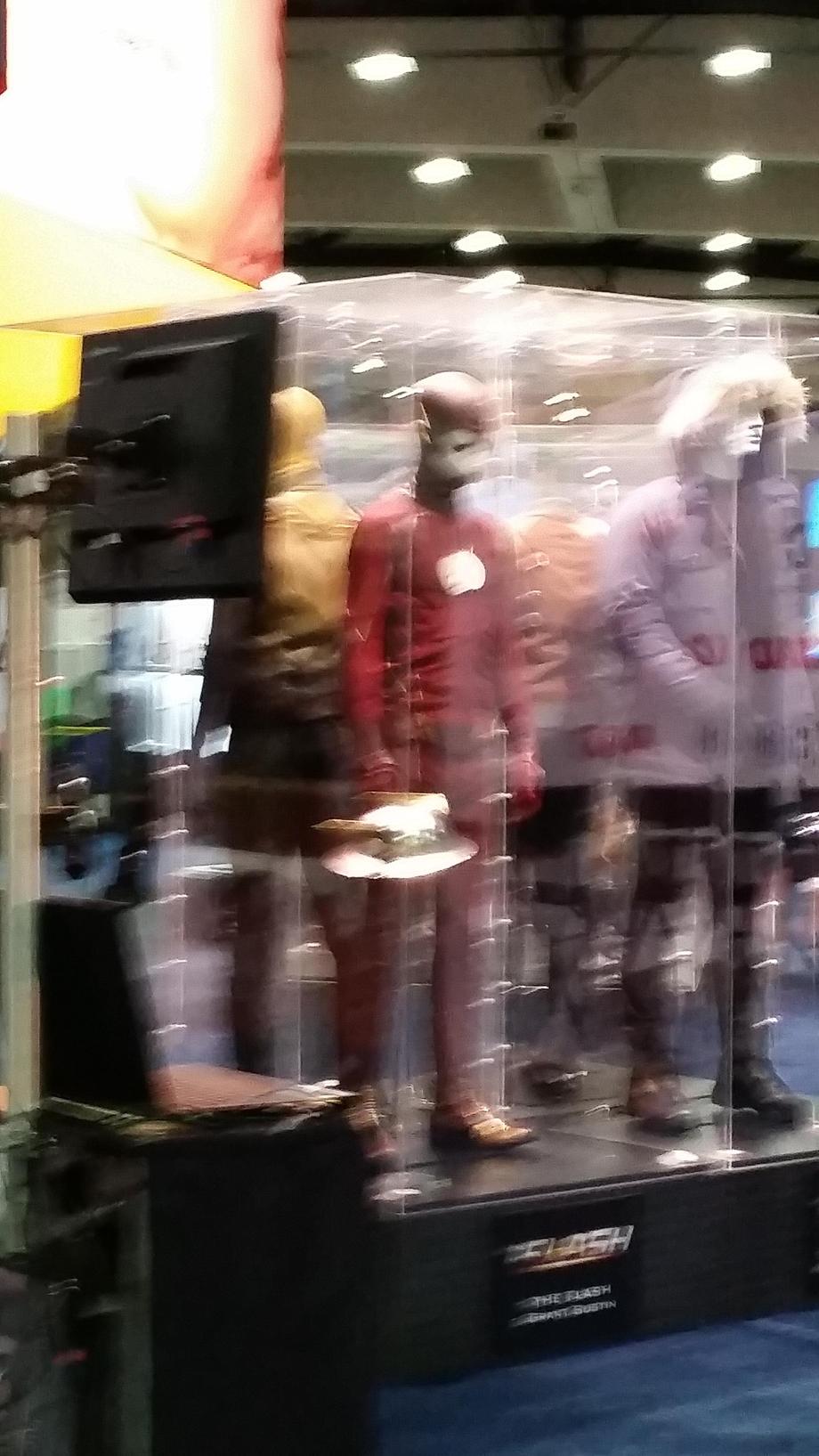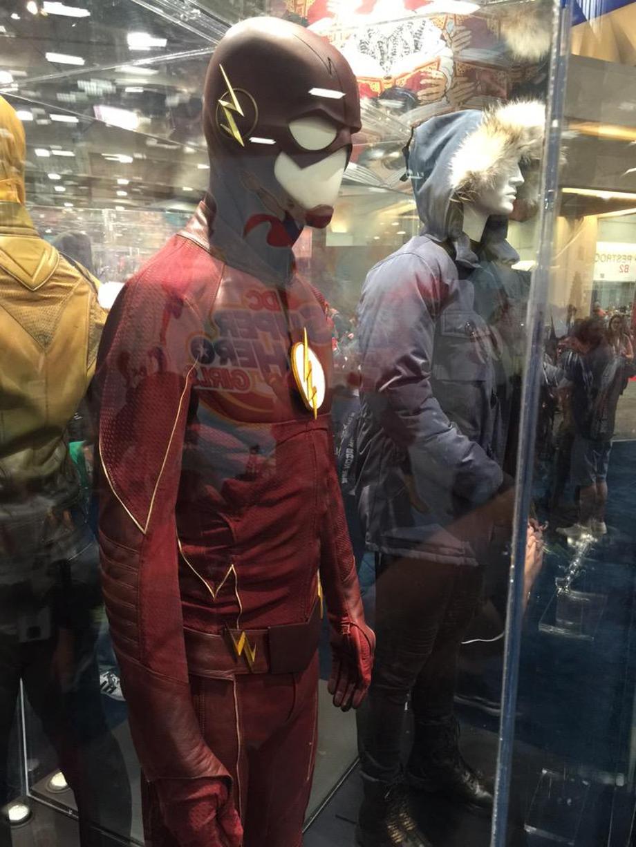 One of the employee's working on seting up Comic-Con this year has snuck a picture of The Flash costume on display, next to Captain Cold's. The Flash costume in season 2 is a brighter shade of red, and has that iconic white elbelm that fans have been clamoring for since episode one. I have no doubt that the picture is real and that the costume would have likely been revealed during the DCTV Panel at Comic-Con