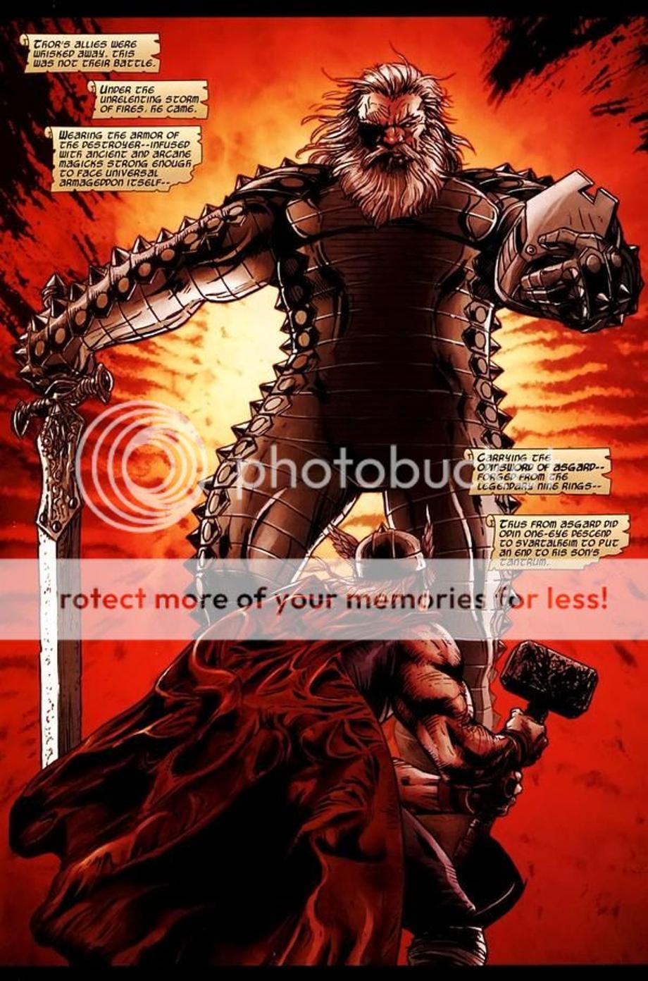 6. Destoryer Odin - The Destroyer is an enchanted suit of armor forged by Odin, and is one of the most powerful weapons in all of Asgard. It is, in itself, lifeless and draws upon the life-force of a host to used for long periods of time. The armor is almost completely invulnerable and gives the bearer strength greater than even Thor. For a time, it was used by Odin as his personal battle armor.