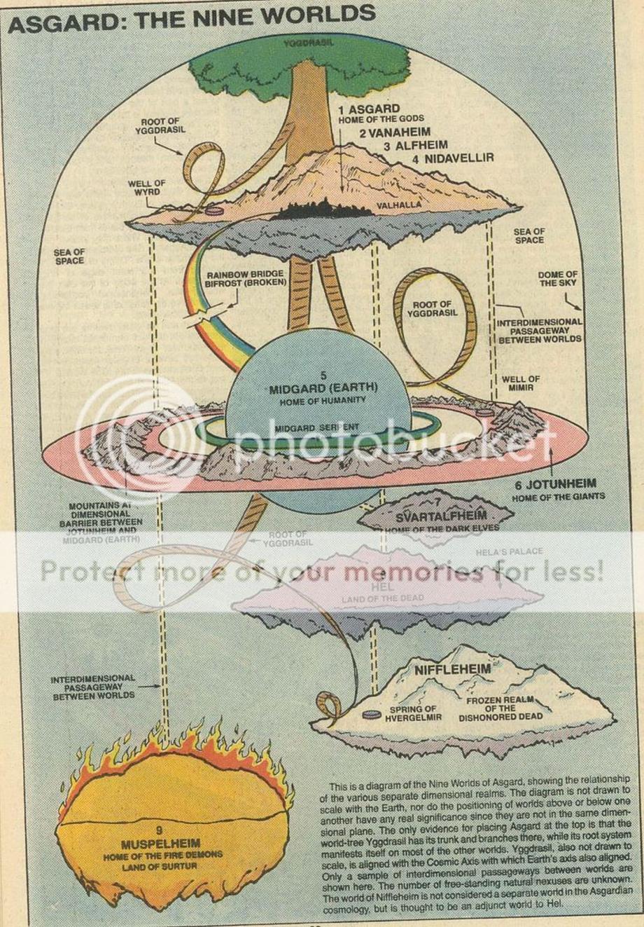 Asgard is connected to at least two other dimensional planes that consist of the major land masses the Asgardians refer to as the “Nine Realms”. Four of the realms exist on the same asteroid-like mass that Asgard exists on. These worlds are Asgard, Vanaheim, Alfheim, and Nidavellir. Another of these worlds that is in a different dimensional plane is the world of Midgard, or Earth. The sixth world is that of Jotunheim followed by Svartalfheim, Hel, and Muspelheim. There are natural nexus portals (passageways) that exist on each of these worlds except for Midgard, and some of these worlds are in direct contact with the roots of Yggdrasil, the cosmic tree that stands in Asgard.