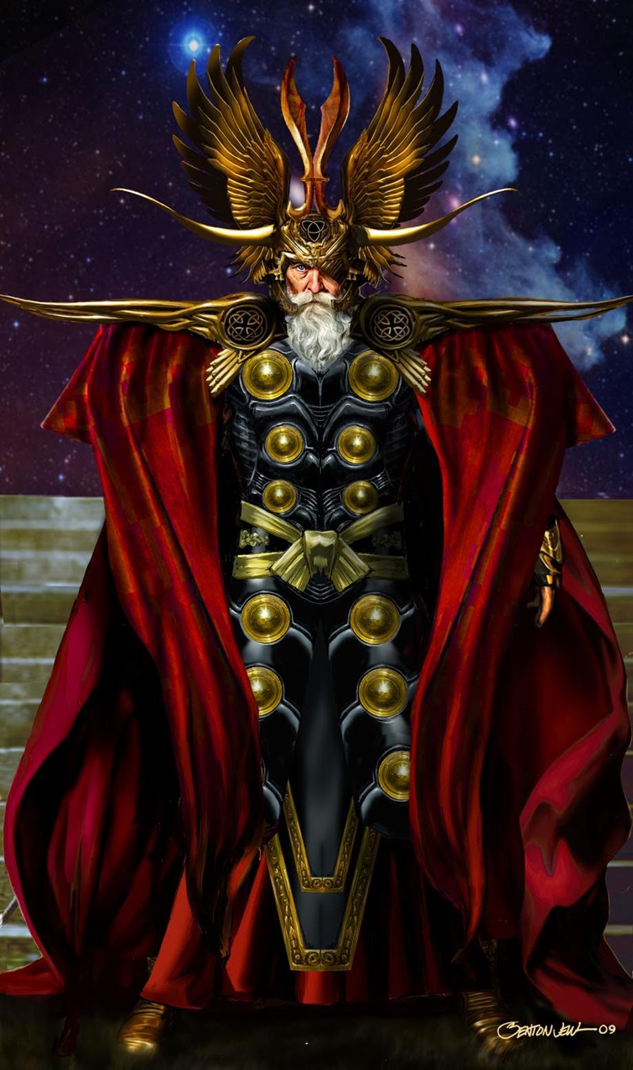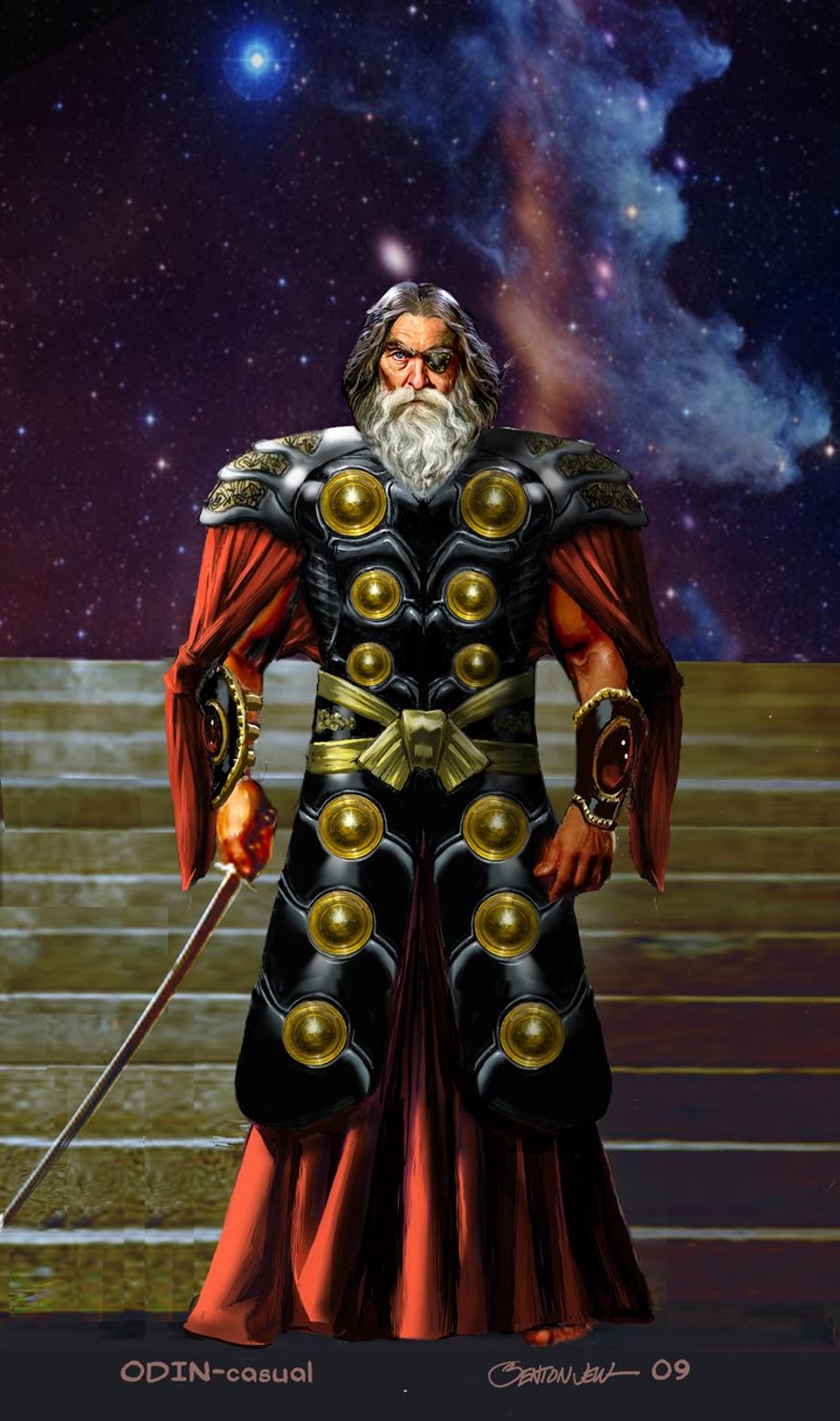"These were pieces made for the first Thor movie for costume designer Alexandra Byrne. I didn't do much on the show as I was only on it for a week or two. The two pieces represent Odin in ceremonial gear as well as more casual clothing. I wanted to make the ceremonial gear very 'Kirby-like' in it's feel. Everything ridiculously wide and vast. All elements point to Odin's face. I also wanted to relate him to the traditional Thor elements (like the disks on his tunic) to tie him to his son. I did the piece in photoshop combining pieces that were digitally hand painted, some photographic elements, and elements from previous versions done by other artists." - Benton Jew