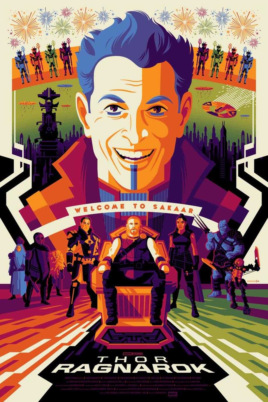 In Thor: Ragnarok, we visited The Grandmaster's home of Sakaar and now artist Tom Whalen has shared the cast and crew poster he was commissioned to illustrate for the Marvel Studios threequel. Take a look!