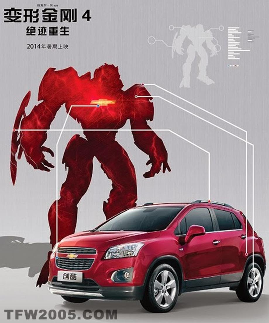 Transformers: Age of Extinction. The new transformer will be seen as a new Chevrolet TRAX when in car-mode. The images and info you see below are part of Shanghai General Motors' new advertising campaign that will tie-in with the film. The vehicle was seen during filming in Hong Kong.