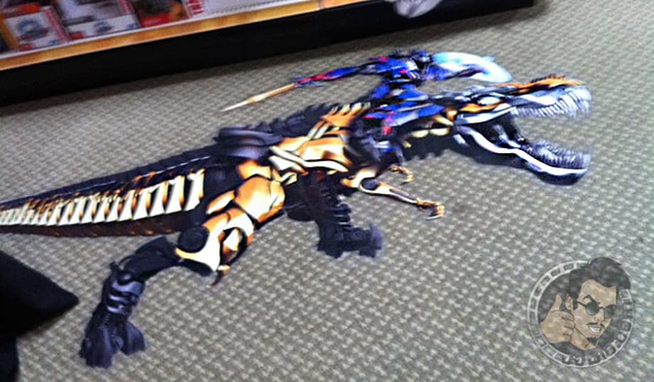 Despite being a little blurry, the following image - taken at a recent trade show - offers up our first look at Optimus Prime riding into battle on the back on Dinobot, Grimlock! It looks like we can expect yet another fun movie from Michael Bay, so hit the jump to check it out.