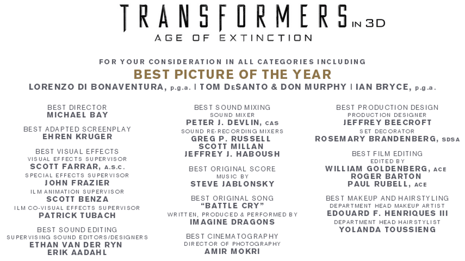Transformers: Age of Extinction to be considered, the category would need to expand so much so it would resemble Santa's naughty list. Even though the odds aren't in Paramount's favor that hasn't stopped them from issuing a