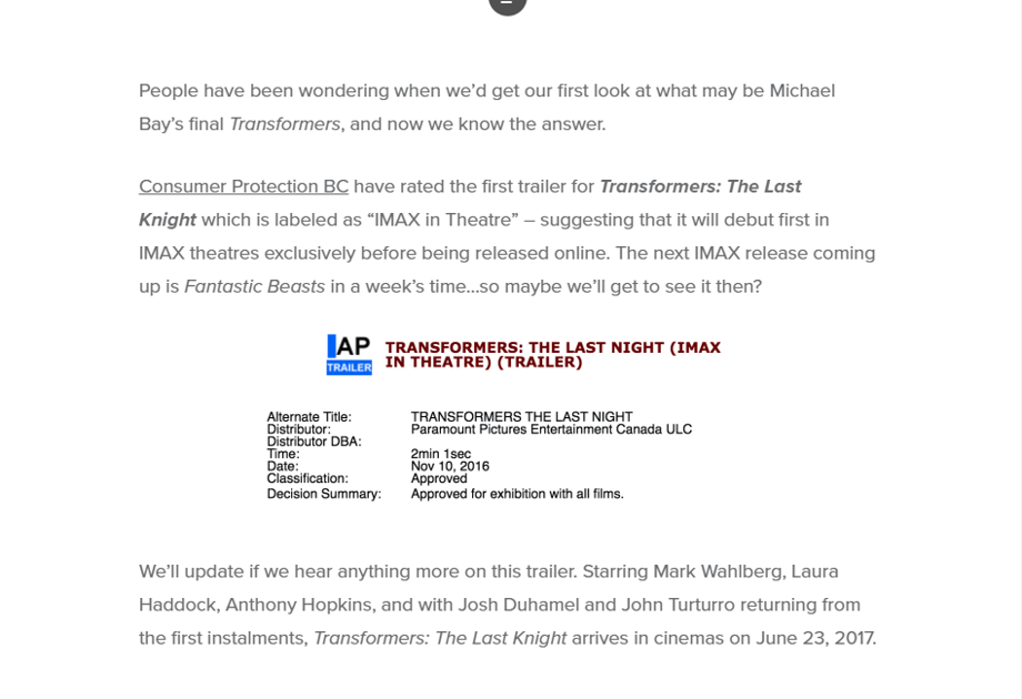 The news comes courtesy of Trailer-Track, who say that the trailer runs for just over 2 minutes and 1 second. This would indicate that it will be unveiled in special Imax locations first, before being released in general public. This will be like Zack Snyder's Batman v Superman Dawn Of Justice Exlusive back in april of 2015. The Trailer for Transformers The Last Knight is exptected to be attached to Fantastic Beast And Wear To Find Them Or Rogue One A Star Wars Story which is Next Month. Since there is no release date it is difficult to say for sure.