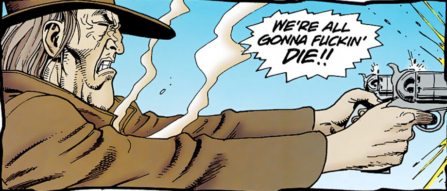 Then, Hugo Root tries to ‘kill’ the Saint but misses, and the Saint shoots his dick off. Then, Jesse orders the Saint to ‘[frick] off from Texas’ And he does, not able to escape the Word, he walks away, but uttering: