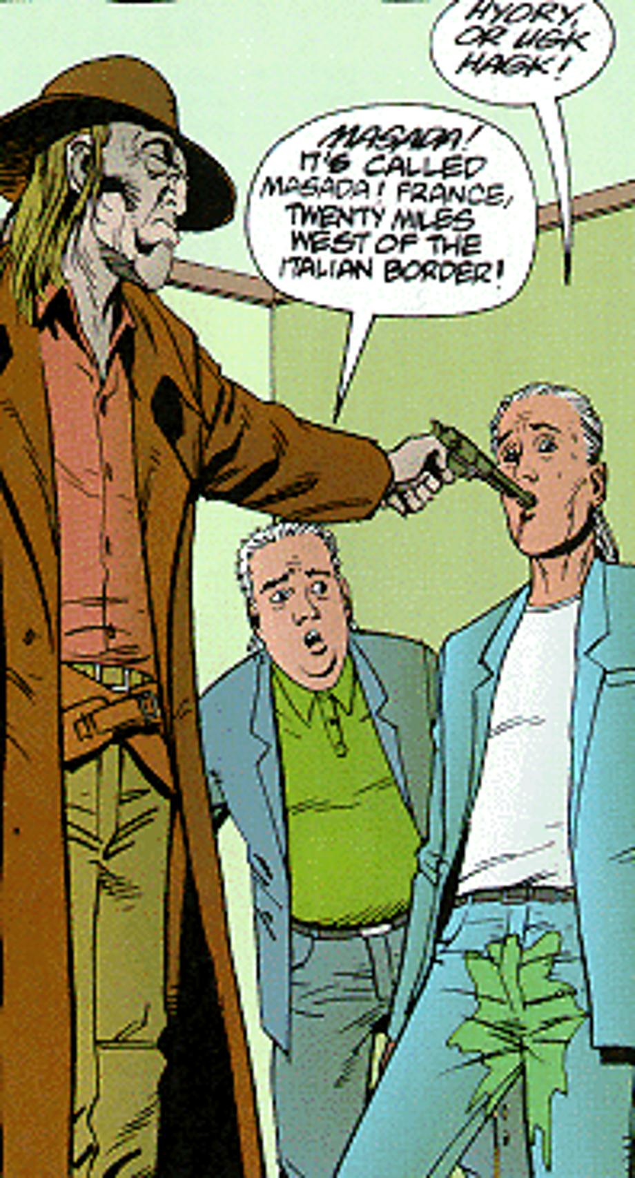 Then, DeBlanc and Fiore don’t want to return, citing the corrupted council of heaven, and be normal mortals. Then, Jesse talks about god, and how he is too much of a ‘crying bitch’ and sets out with Cass and Tulip to find the ‘pig[frick]in’ son of a whore’. END: We see a white limo park in front of an apartment building. Inside, is a black man and white woman, who have bussiness suits and another man, who's way too annoying and chatty. Then, Herr Starr enters the car, and talks about their mission and ''the Preacher with the demon and angel spawn'". Then, when the annoying guy makes an unfunny comment on the whole thing, Starr shoots his FACE off, making him just a skull filled with guts and veins.