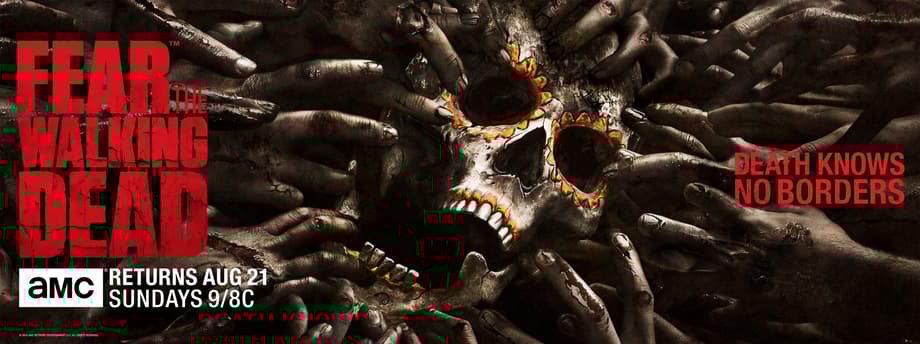 Ahead of the Fear The Walking Dead San Diego Comic-Con panel on Friday, July 22, at 12 noon PT in Hall H; AMC has released some ominous Mexican Día de Muertos-style key art for season 2B of the zombie drama spin-off. Plus, we have the first official stills, featuring Nick (Frank Dillane) taking a little stroll, and some very fresh looking walkers.