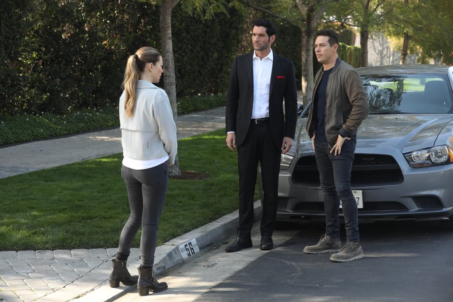 LUCIFER: L-R: Lauren German, Tom Ellis and Kevin Alejandro in the “A Devil of My Word” season finale episode of LUCIFER airing Monday, May 14 (8:00-9:00 PM ET/PT) on FOX. CR: Jordan Althaus / FOX