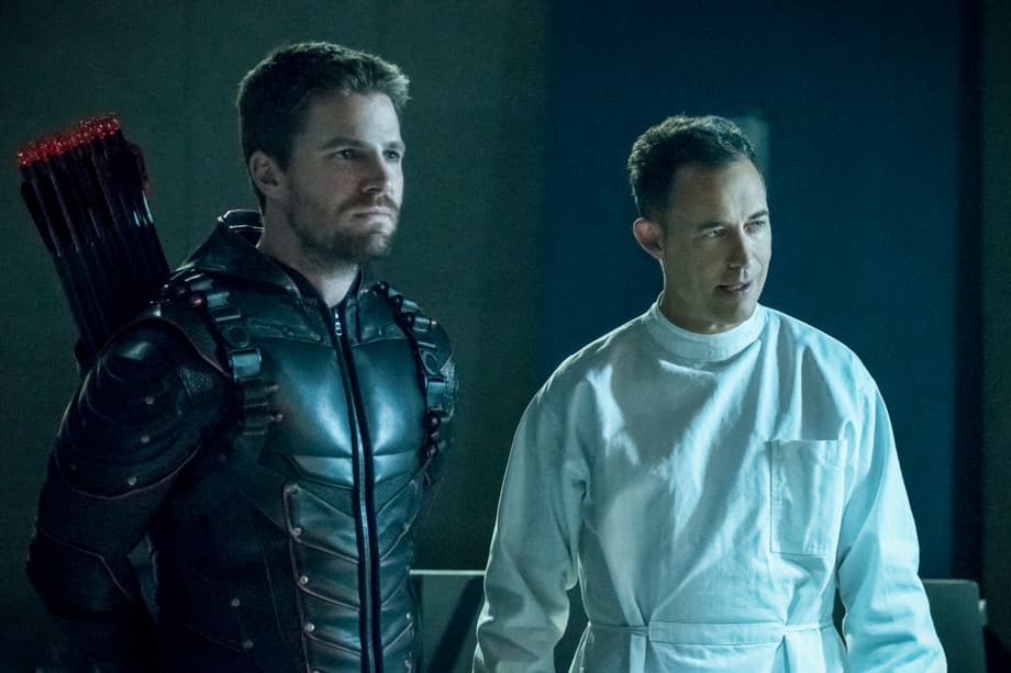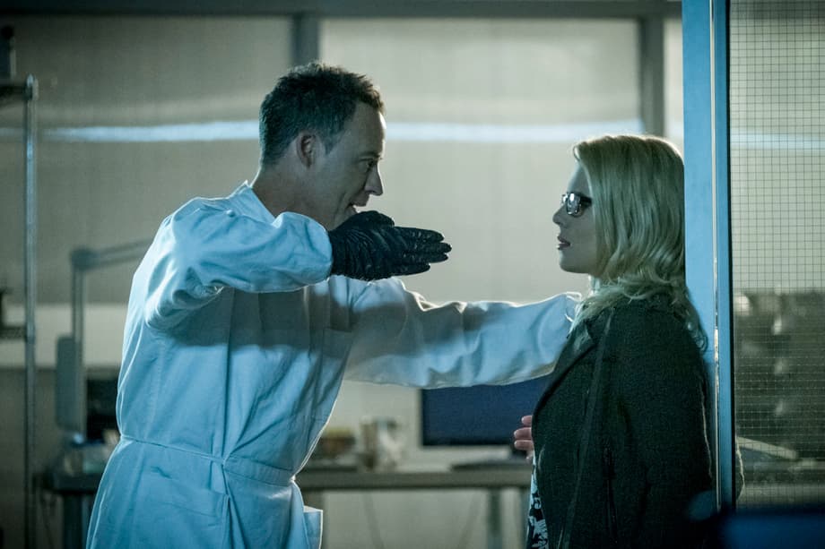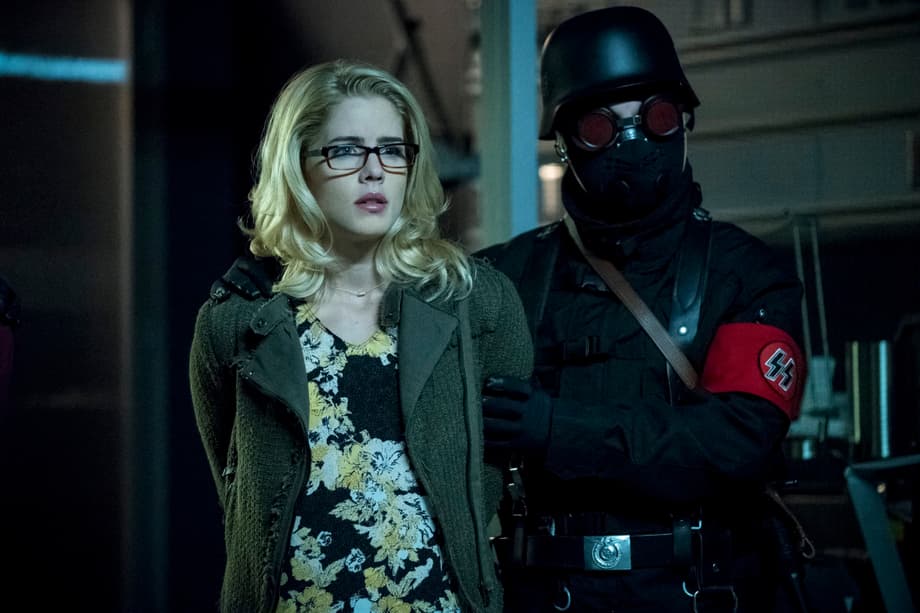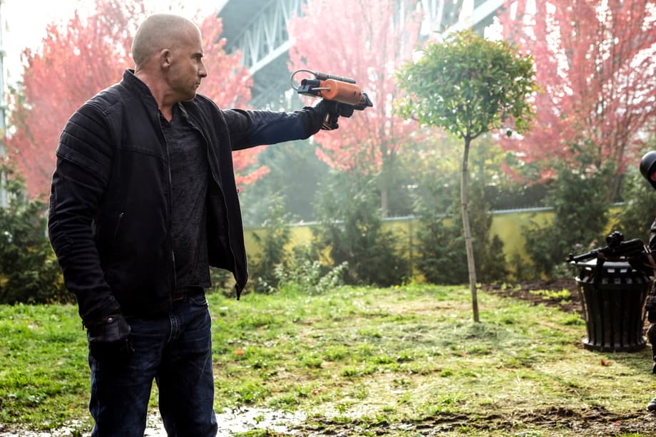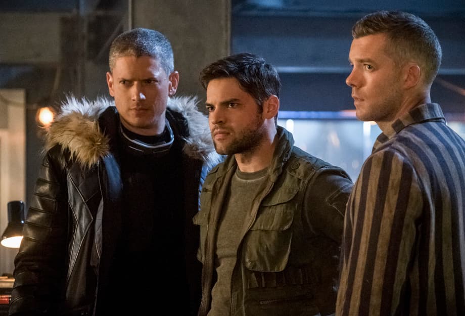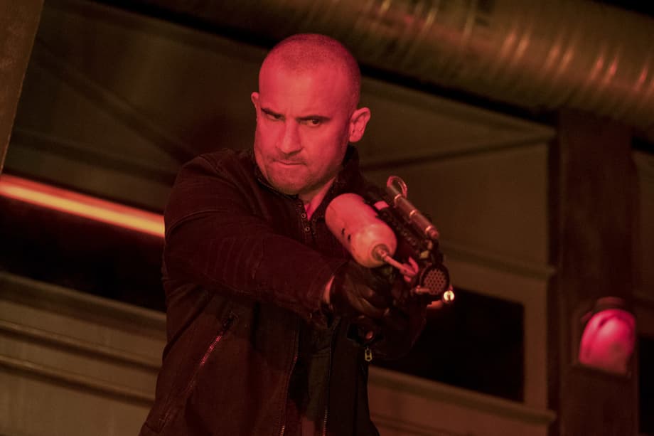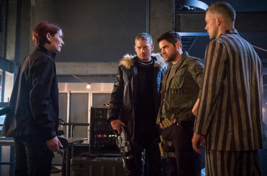 We're also treated to a first look at Wentworth Miller's final bow as Citizen Cold (with some cool new shades) and Tala Ashe as Zari in her new costume. Also, the new batch of photos also reveal the leaders of the nasty Earth-X villains, who are all played by three very familiar faces pulling double-duty. Melissa Benoist is playing Kara's Earth-X counterpart Overgirl, Tom Cavanagh is playing the Reverse-Flash Dark Flash, and Stephen Amell is playing Dark Arrow.