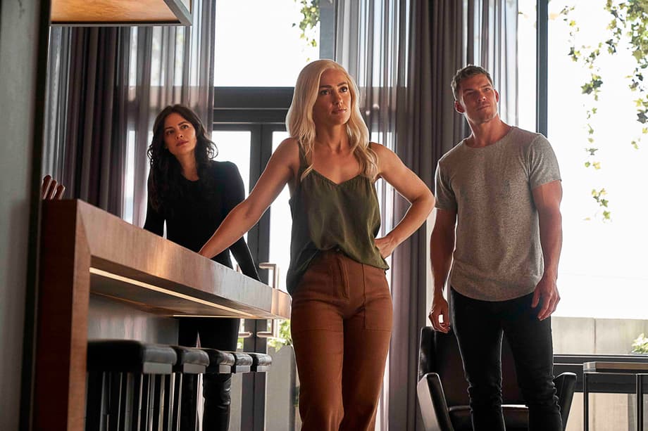 The photos aren't particularly spoiler-y, but we do have shots of Jericho in Titans Tower with Dick, Donna (Conor Leslie), Dawn (Minka Kelly) and Hank (Alan Ritchson), which could indicate that he may have, at some point, been a part of the team and/or living in the Tower. Plus, there are also awesome shots of a showdown between Robin and Deathstroke.