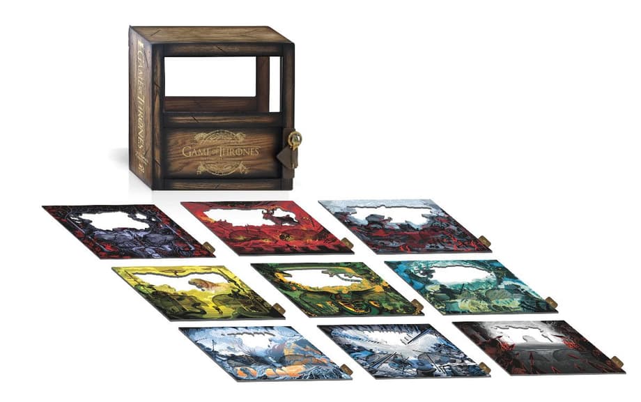 Game of Thrones®: The Complete Collection is packaged in a visually stunning wooden shadow box case, featuring beautiful, multi-layered panel designs by Robert Ball (the artist behind the “Beautiful Death” series) that summarize the Game of Thrones story. Each season is represented by a different layer, showcasing iconic characters and memorable moments from the show, all clambering toward the Iron Throne. The set also contains a “Hand of the King” pin clasp, which holds all nine custom plated disc sleeves. Click HERE to preview an unboxing of the set.