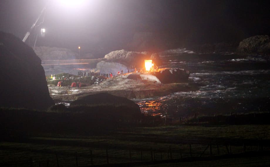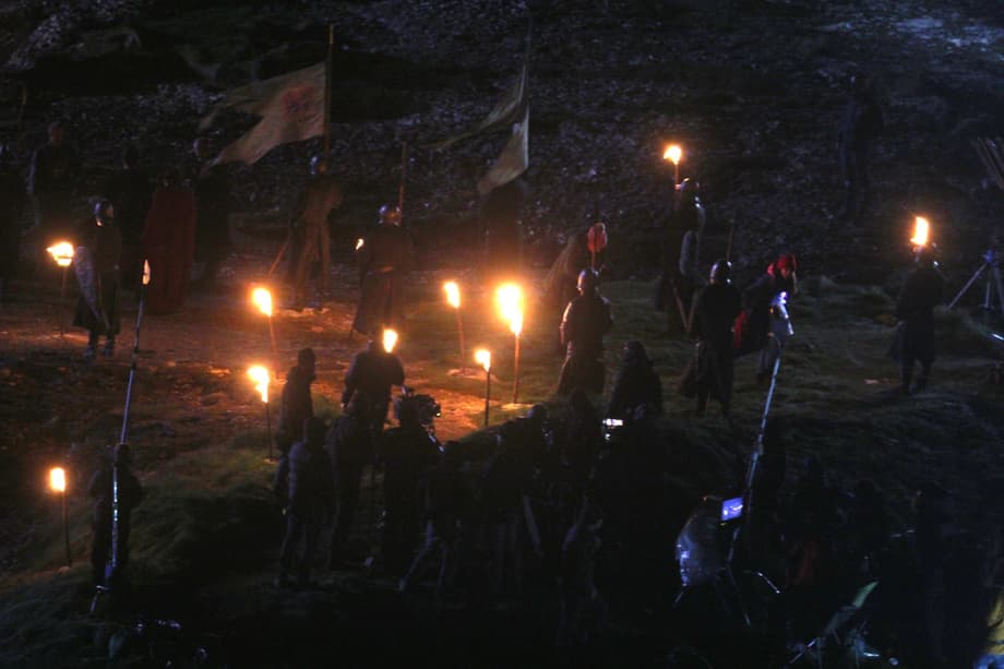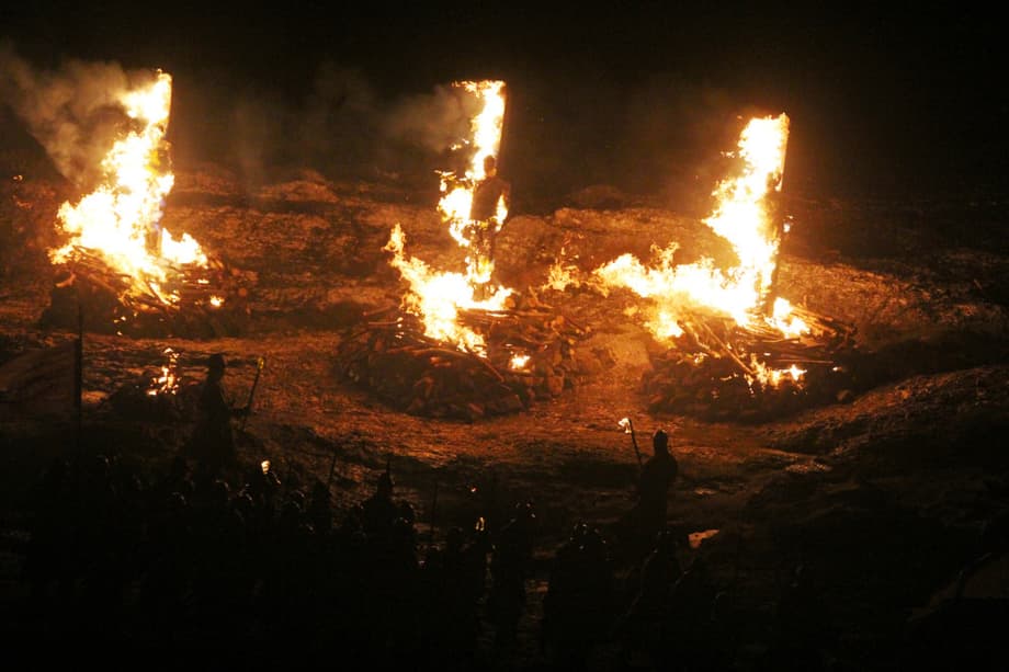 So as anyone who has read the source novels will know, these are in fact the final three Stark kids being burned alive...Ok, not really -- they're actually just three hapless prisoners being sacrificed to appease the "Red God", so that Stannis Baratheon might one day be king. There doesn't appear to be any principal cast members visible in the pics below, but we assume both Carice van Houten (Melisandre) and Stephen J. Dillane (Stannis) are around somewhere.