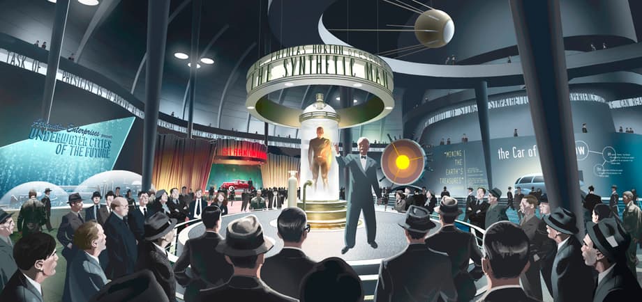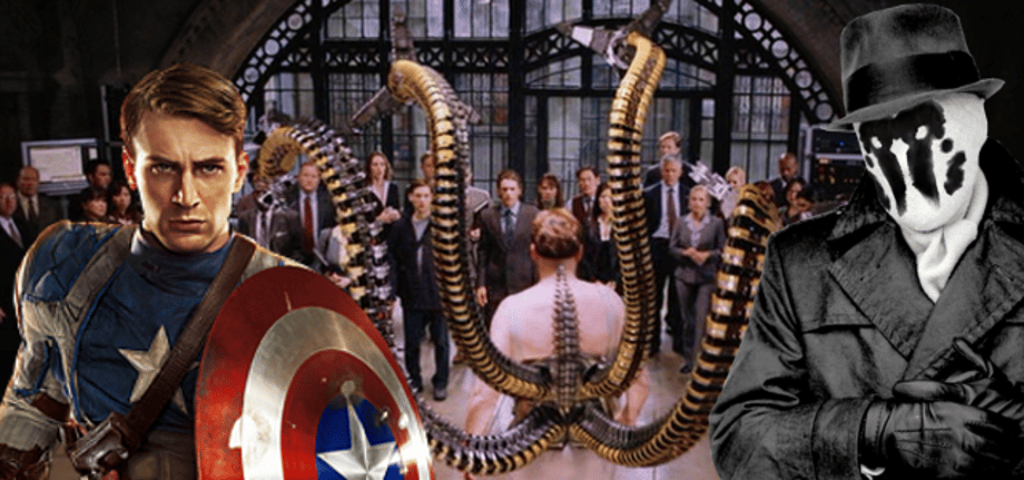 Adam Brockbank's official website has a great collection of key frame and concept art he created for various big-budget Hollywood films. Let's take a look at the artwork that he created for three comic book movies: Joe Johnston's Captain America: The First Avenger, Sam Raimi's Spider-Man 2 and Zack Snyder's Watchmen (2009). For the 2011 Marvel Studios film, Brockbank worked on the interior of the Hydra train, Allied headquarters key frame art, future technologies exhibit and the army recruitment paviliion. For the 2009 film adaptation of Alan Moore and Dave Gibbons' highly-acclaimed graphic novel, Brockbank worked on Dr. Manhattan's cathedral (elaborate clock-like device) on Mars, as well as character designs for Ozymandias (Matthew Goode), and Rorschach (Jackie Earle Haley).