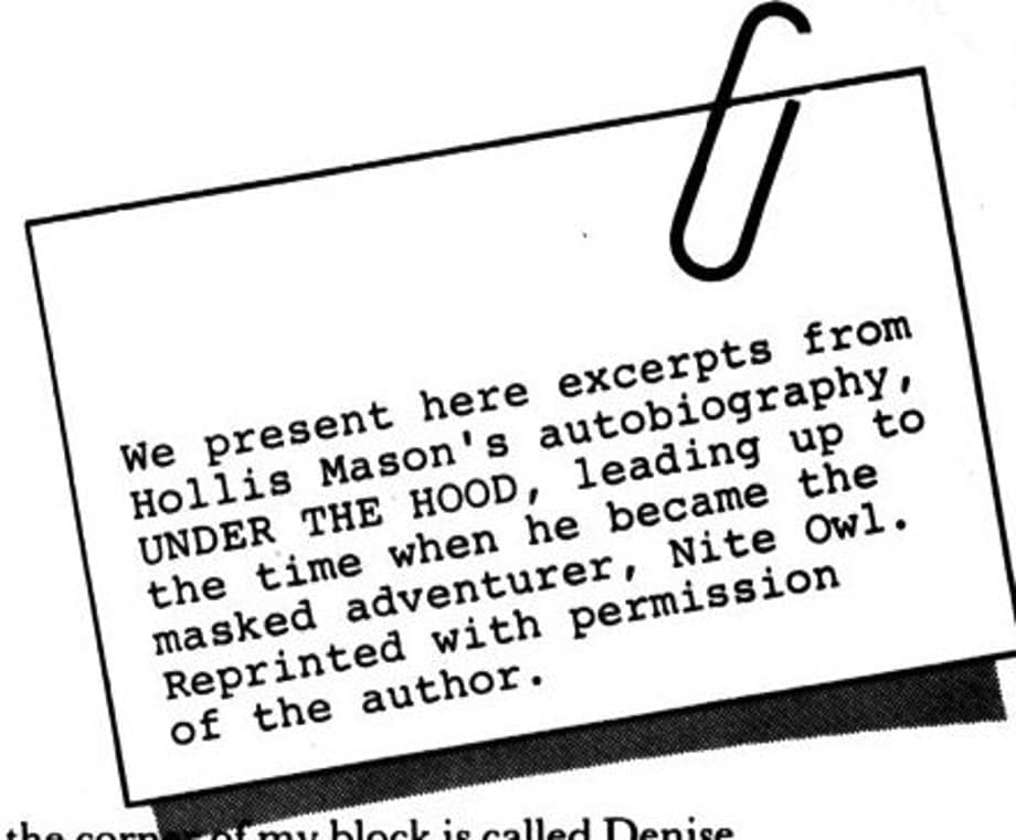 The rich history of the Minutemen is explored more in-depth throughout the pages of the original novel, and especially in the supplemental materials such as excerpts from Hollis Mason's autobiography Under the Hood. With it, Moore and Gibbons contrasted the early days of superheroics with the much shadier, more subversive characters from the book's alternate 1986. This commentary on comic books of the past versus the then-present state of the industry is crucial to the deconstruction of the superhero that is the backbone of Watchmen.