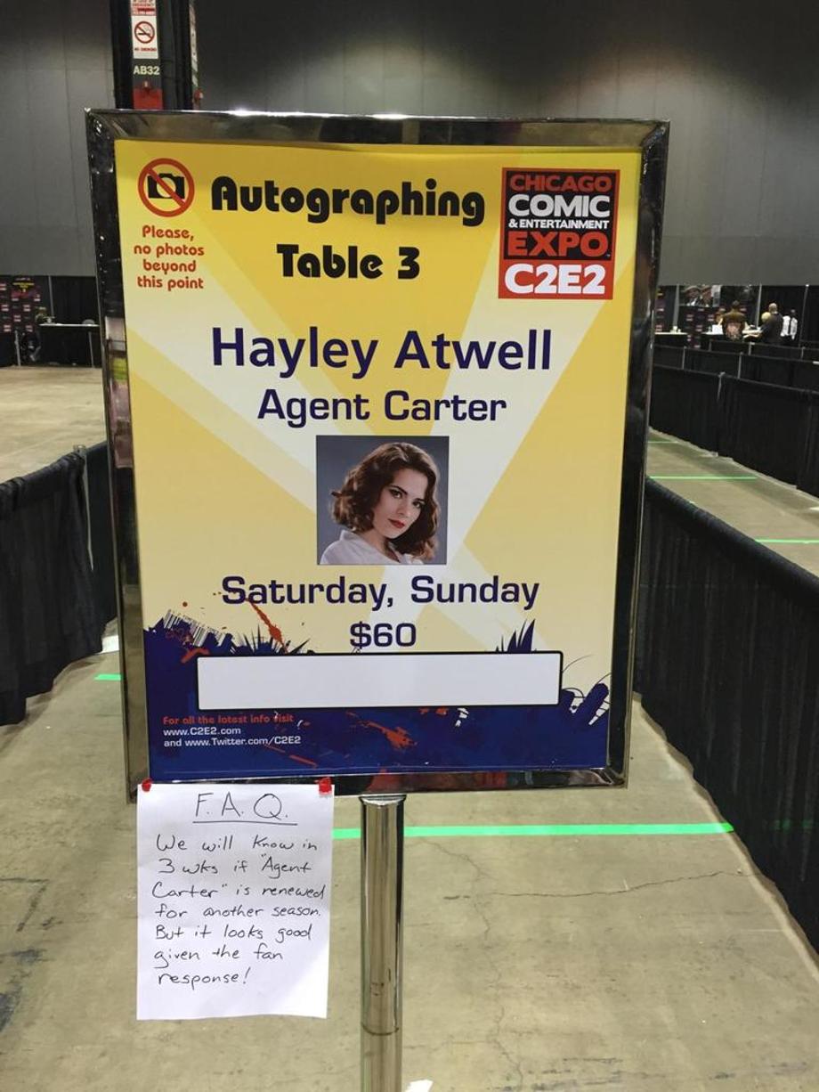 The low viewer numbers led many to think that a second season was unlikely. Recently however, many websites have stated that a 2nd season is seeming more likely. And now, star Hayley Atwell has added fuel to the fire! At the recent Chicago Comic and Entertainment Expo, a hand-written 'frequently-asked questions' note was pinned to her autograph stand. It read 'We will know in 3 weeks if 'Agent Carter' is renewed for another season. But it looks good given the fan response.'