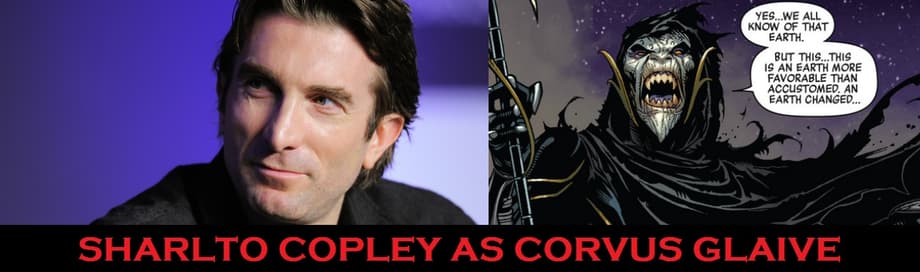 Corvus Glaive is one sinister looking and mean villain with a menacing personality that screams out a true monster which is what he is. Sharlto Copley displayed his villanious chops in the film Elysium and would be perfect in this role. Some theorize Corvus Glaive was The Other in The Avengers film do to similiar appearance, but who knows he could have a brother out there somewhere.