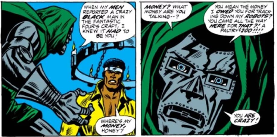 This is a pretty hardcore reference which comes in the sixth episode when Luke is attempting to rescue Piranha from Bushmaster's men. When the businessman/gangster points out that Luke is a "hero for hire," Power Man is quick to respond with, "Then where's my money, honey?" This line was pulled straight from Luke Cage: Hero for Hire #9 when Luke was hired by none other than Doctor Doom.