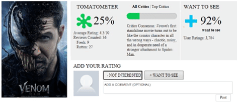 As for the Critics Consensus, that says: "Venom's first standalone movie turns out to be like the comics character in all the wrong ways - chaotic, noisy, and in desperate need of a stronger attachment to Spider-Man." Ouch. Are you guys still going to check out Venom this weekend?