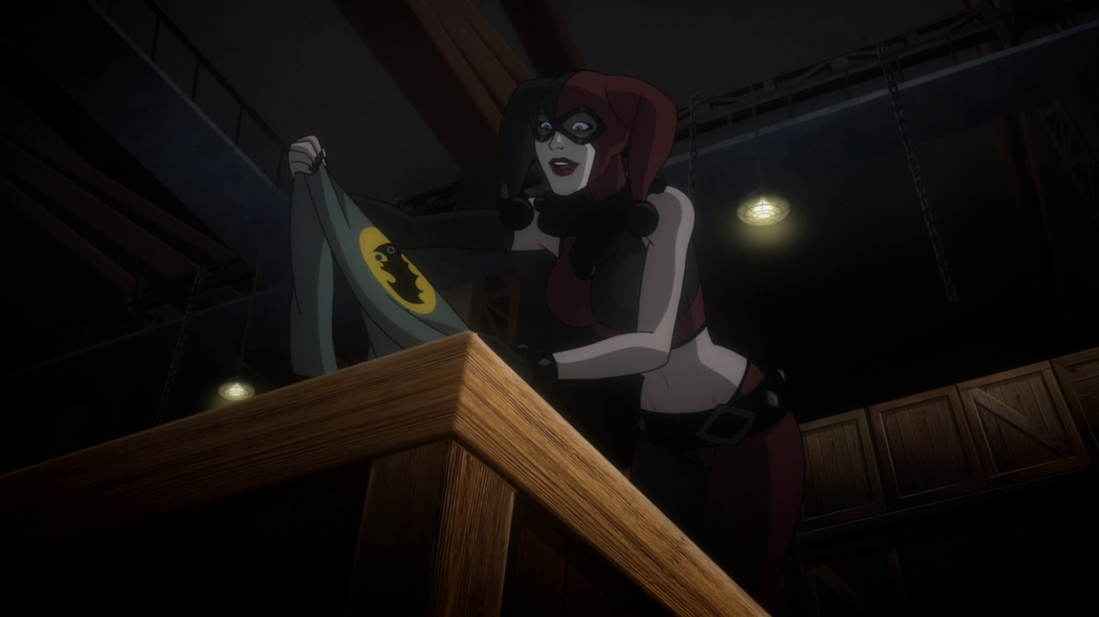 Next with Harley Quinn pulling out a Bat costume that Joker wore during a train robbery which teases that the second Arkham Origins game may revolve around Joker impersonating Batman to frame him for defying his demands on killing Bane in Arkham Origins