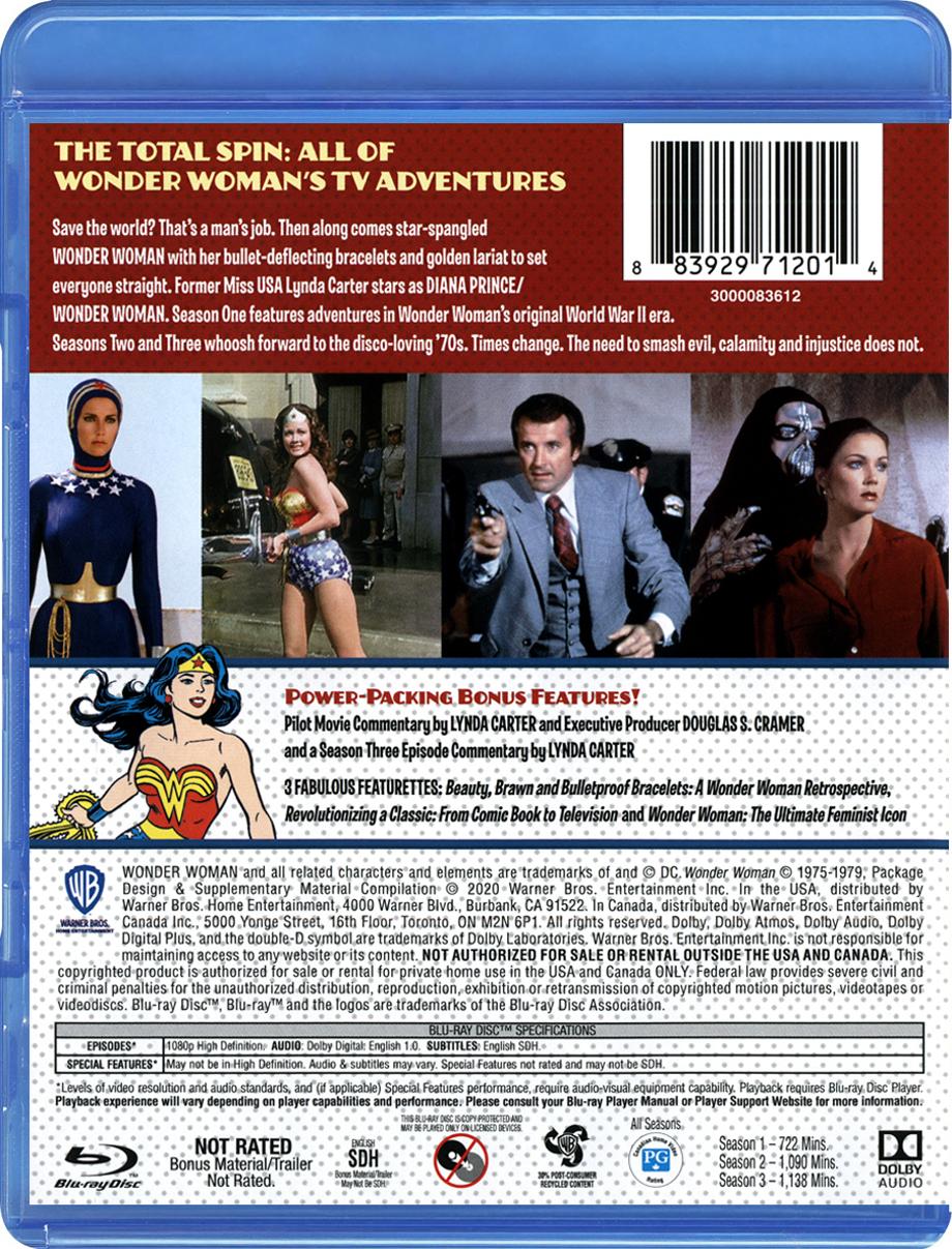 The Wonder Woman: The Complete Collection Blu-ray box set (USA $64.99 SRP, Canada $69.99 CAN) comes complete with all 59 episodes, plus the treasured pilot movie, across 10 discs. Bonus features include: