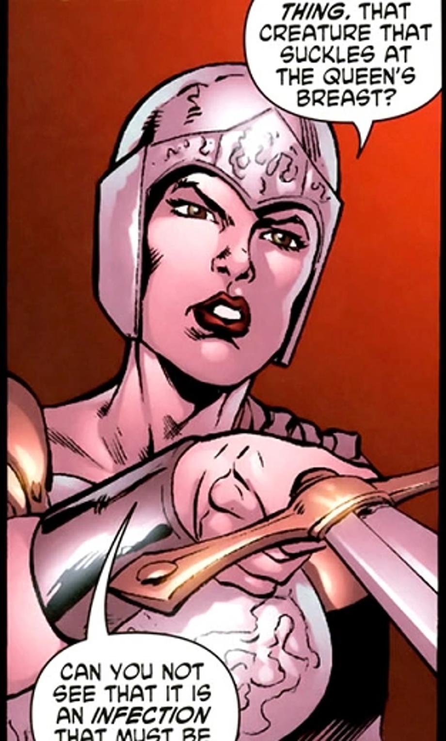 This chick scares me. She reminds me of what the evil chick in Misery would be like if she had super powers. She´s a psychological match for WW, and she´s very strong, with cool magical weapons. Most of all being her magic Bow and Arrow, with arrow tips made of the tears of Medusa. She´s also a skilled warrior and general, but most of all she´s a sick puppy obsessed with Hyppolita, Queen of the Amazons, with a predilliction for infanticide, who believes in her cause, that the only way to return Paradise Island back to its former harmony, is to rid it of the dragon child Diana princess of Themyscira.