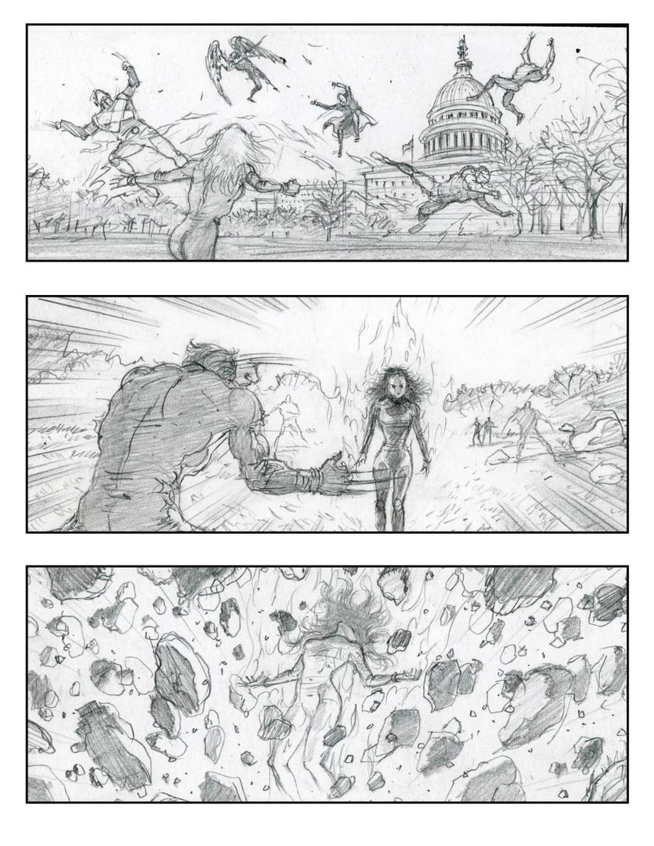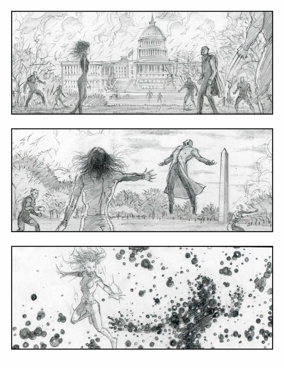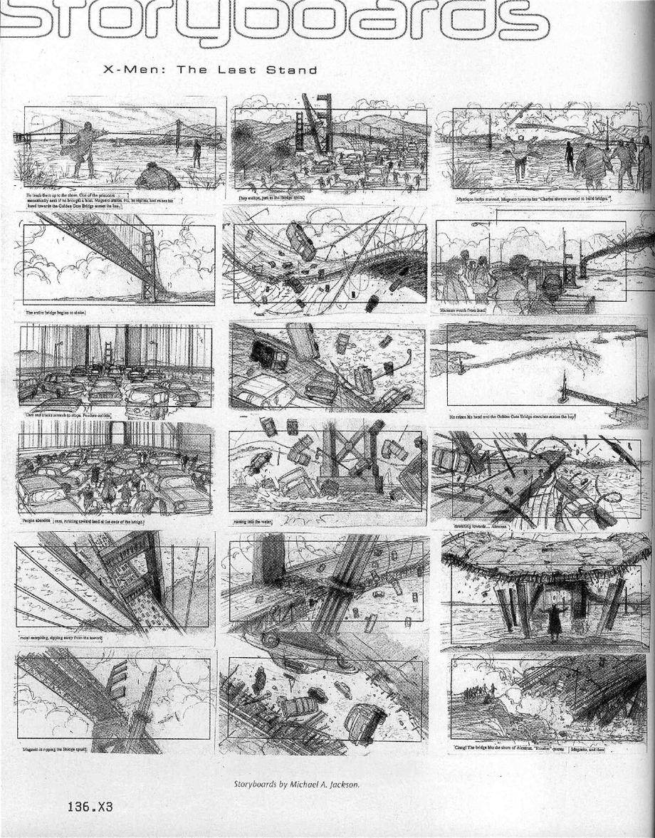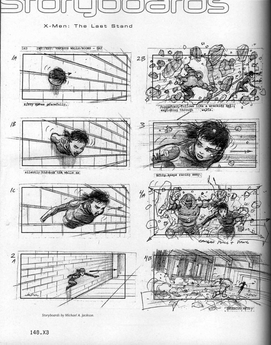 X-Men fans, as several characters are killed off. The most controversial death scene would have to go to James Marsden's Cyclops who is unceremoniously killed off-screen near the beginning of the film. One scene that I thought was handled actually quite well, was the death of Professor Charles Xavier (Patrick Stewart). Xavier goes to confront Jean at her childhood home. He tries to re-establish the mental blocks he used to suppress her powers, but Jean's alter-ego, The Phoenix, is too strong. She unleashes her powers upon Xaviere by lifting him off his wheelchair and disintegrating him. Well, apparently at one time, The Phoenix was supposed to vaporize Magneto (Ian Mckellen) as well, as seen in Michael Anthony Jackson's storyboards below. Which is much different than the theatrical version, which had Beast (Kelsey Grammer) sneaking up behind Magneto during the final battle at Alcatraz and injecting him with "the cure."