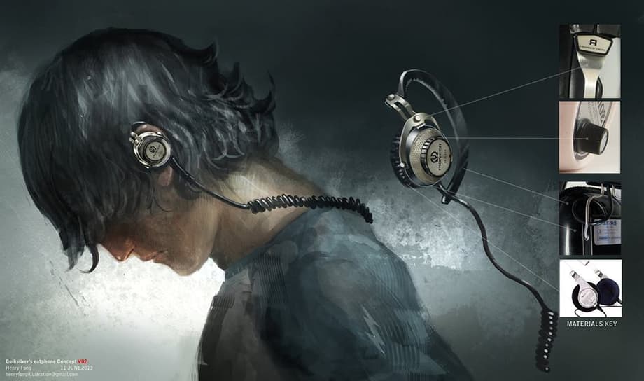 Concept artist, Henry Fong ("Pacific Rim"), updated his site with concept art for X-Men: Days of Future Past. These prop designs are for Quicksilver's musical device he uses while listening to Jim Croce's Time In A Bottle during the Pentagon kitchen scene.